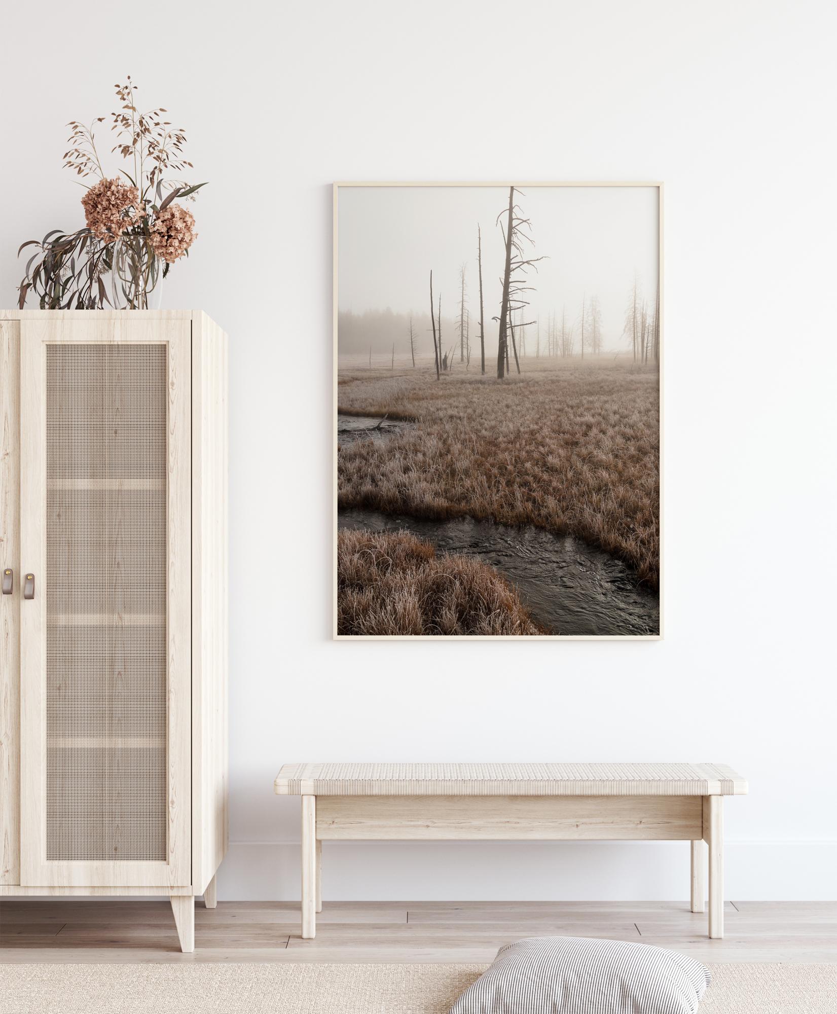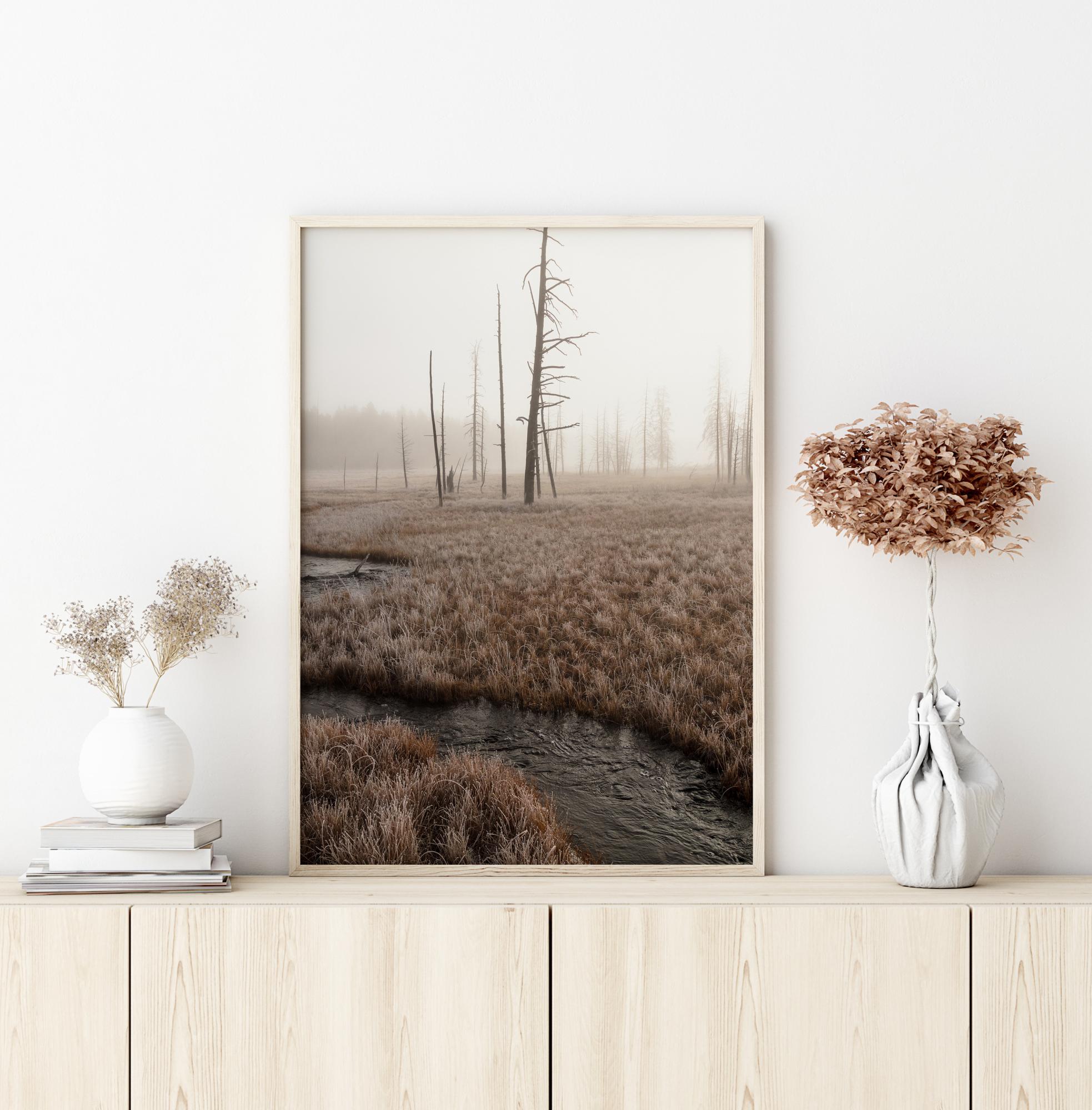 Üleloomulik maastikplakat, millel on surnud puudega tasandik ja selle kaudu voolav jõgi. Sellel varahommikusel fotol katab udu puid ja kollast rohtu. Jälgi jõge, kui see lookleb läbi maastiku kaugemasse metsa. Eksle teise aja ja koha radadel, kui selle üles riputad.