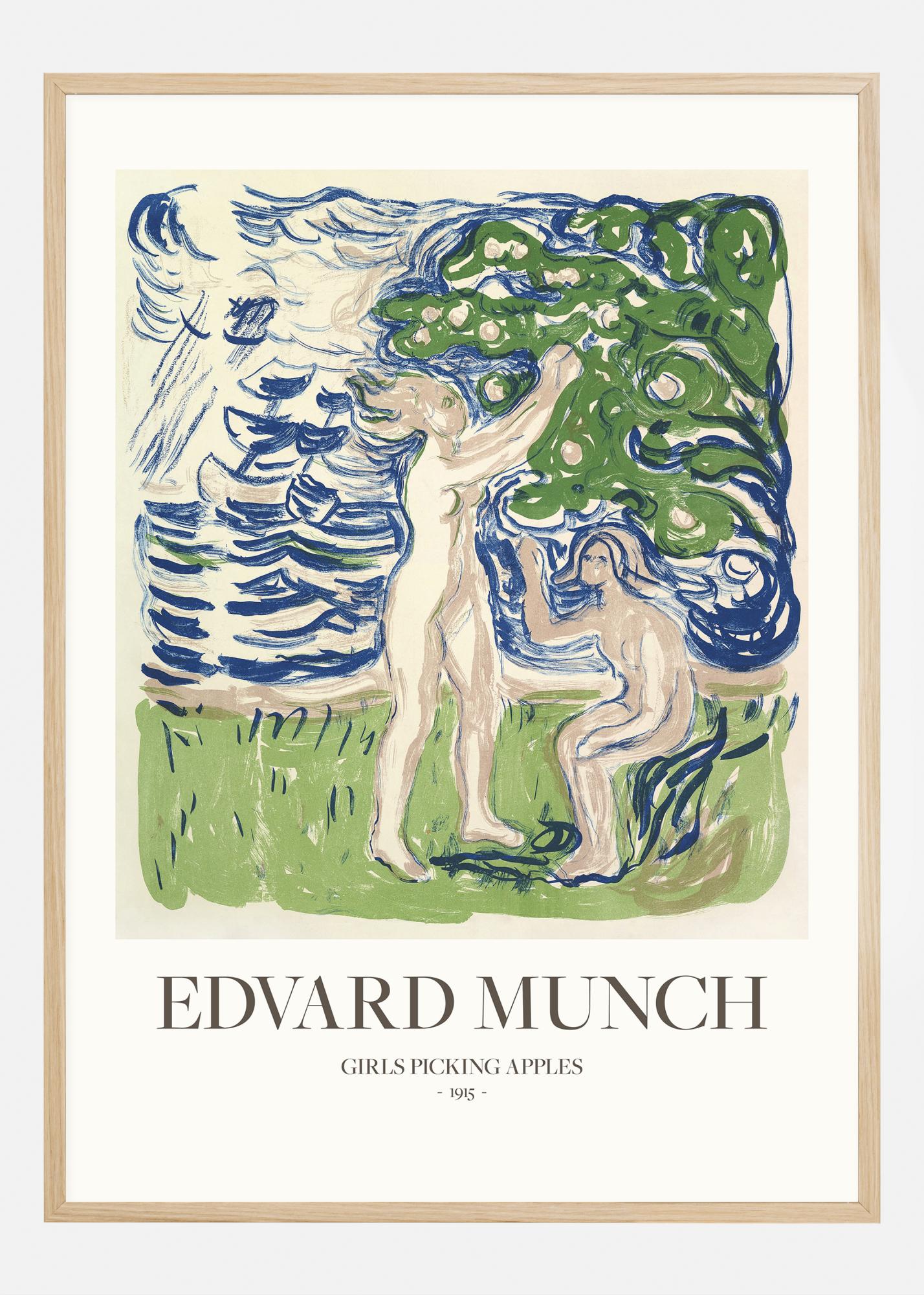 See poster kujutab 'Tüdrukud õunu korjamas', Edvard Munchi 1915. aasta teost, mis tabab idüllilist ja meeleolu loovat stseeni. Kunstiteos annab lihtsa, kuid väljendusrikka kujutise kahest figuurist puude vahel, nende kehasid ja nägusid rõhutatakse lõtvade, vabade pintslitõmmetega. Värviskeemi domineerivad värske roheline ja maalähedane pruun, mis loovad murulapid ja puutüved, samal ajal kui sinine ja valge taevas pakuvad elavat tausta, mis rõhutab kirkad õunarohelisi toone ja pehmeid nahavärve. See trükis on austusavaldus elu lihtsale rõõmule ja sobib ideaalselt kunstilise puudutuse lisamiseks, et tuua igale ruumile looduse ja vabaduse tunnet.