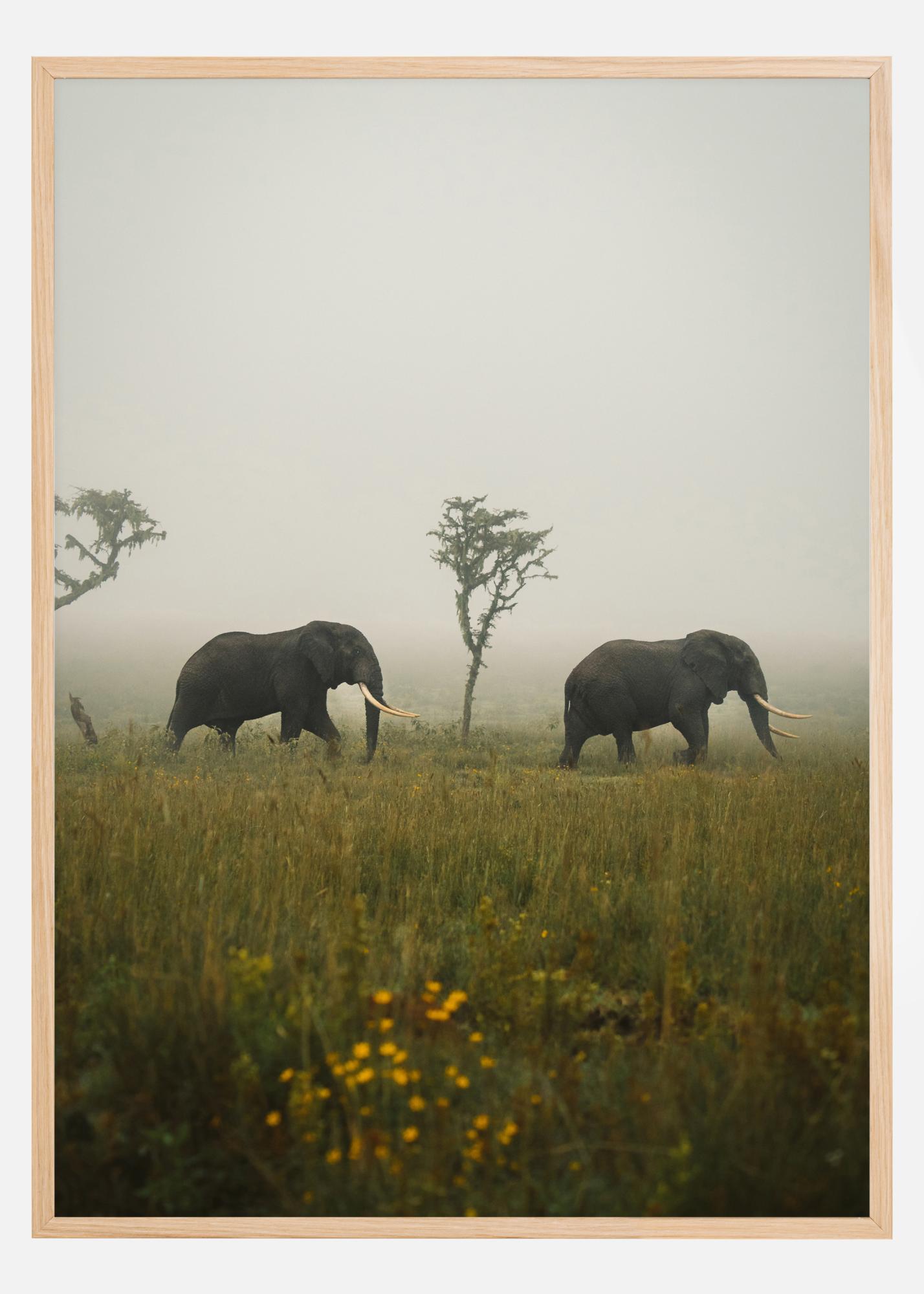 Loodusfoto paarist elevantidest, kes uitavad kõrges rohus paljaste puude vahel. Tausta tihe udu loob teravaid kontraste, mis toovad suured loomad eriti selgelt esile. Plakat neile, kes armastavad savanni ja selle suurimaid elanikke!