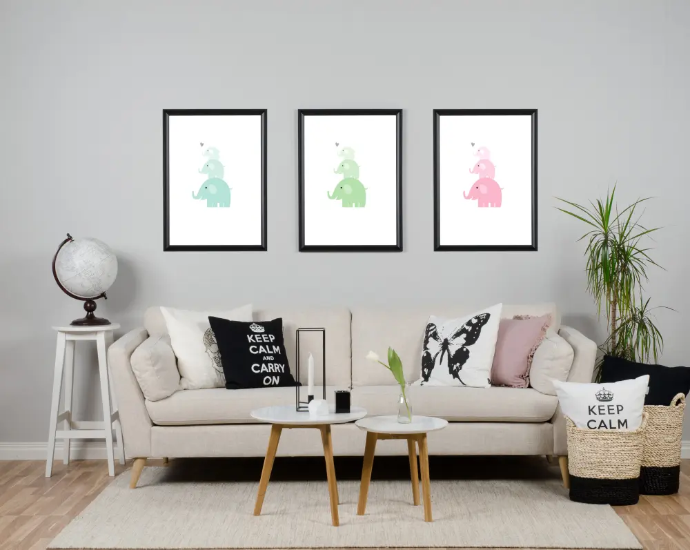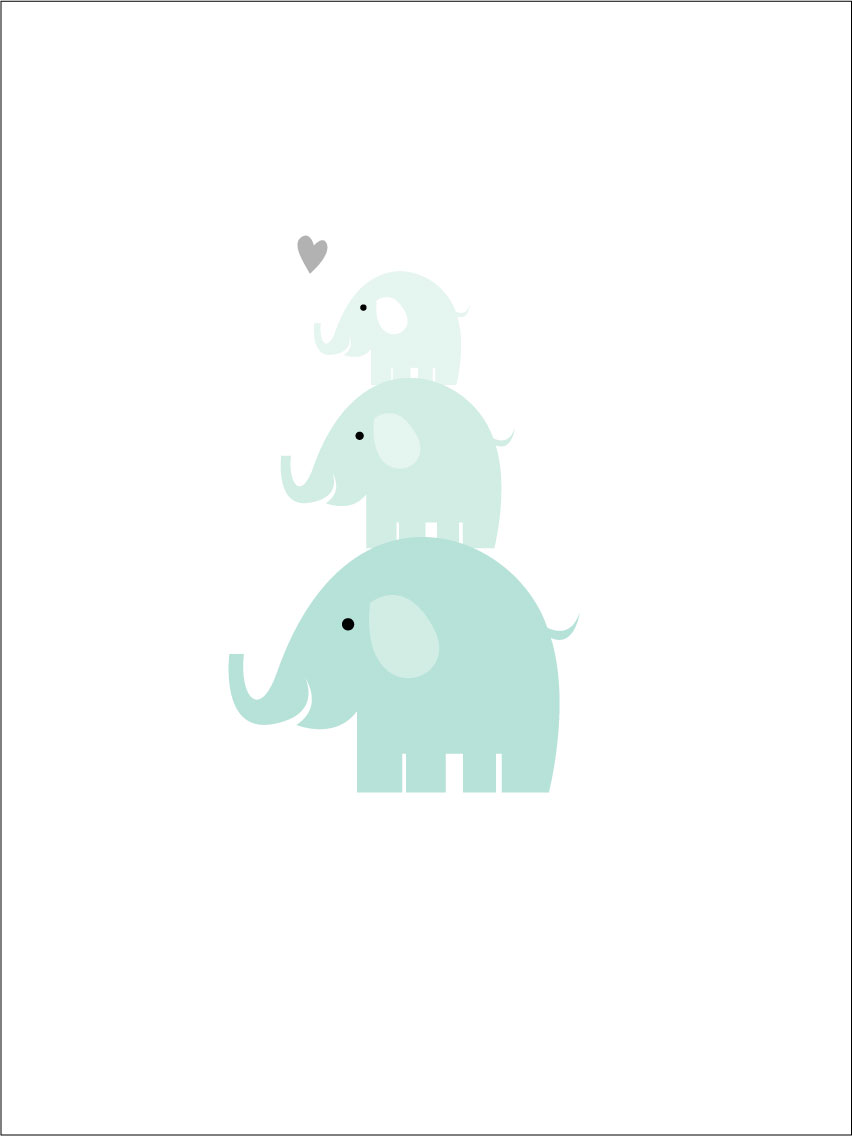 Plakat trükitud motiiviga, millel on kolm armas elevanti jääsinises toonis, virnastatud üksteise otsa valgele paberile. Midagi neile, kes armastavad savanni kõiki loomi, kuid sobib eelkõige nooremate laste tuppa. Plakatit saab kombineerida teiste loomade või elevantide plakatitega samas värvitoonis, et luua laste toas imeline muinasjututunne.