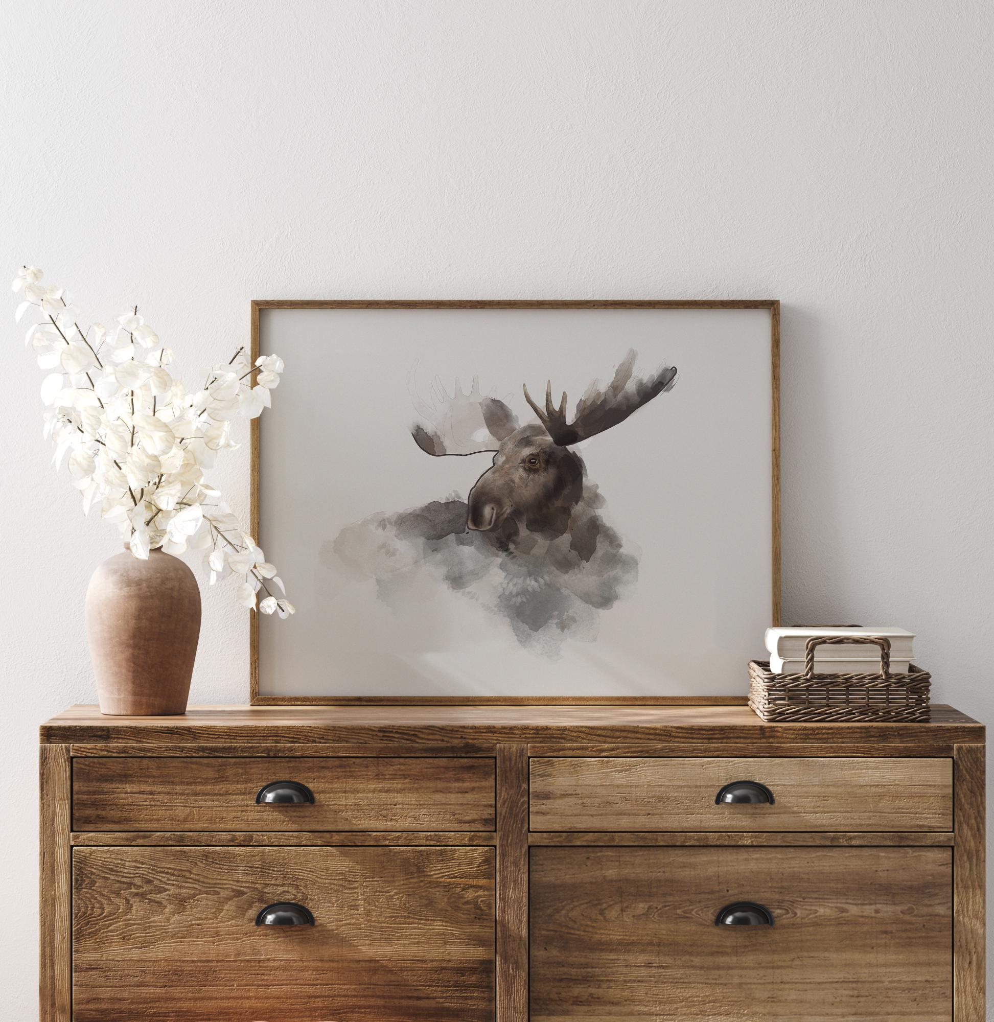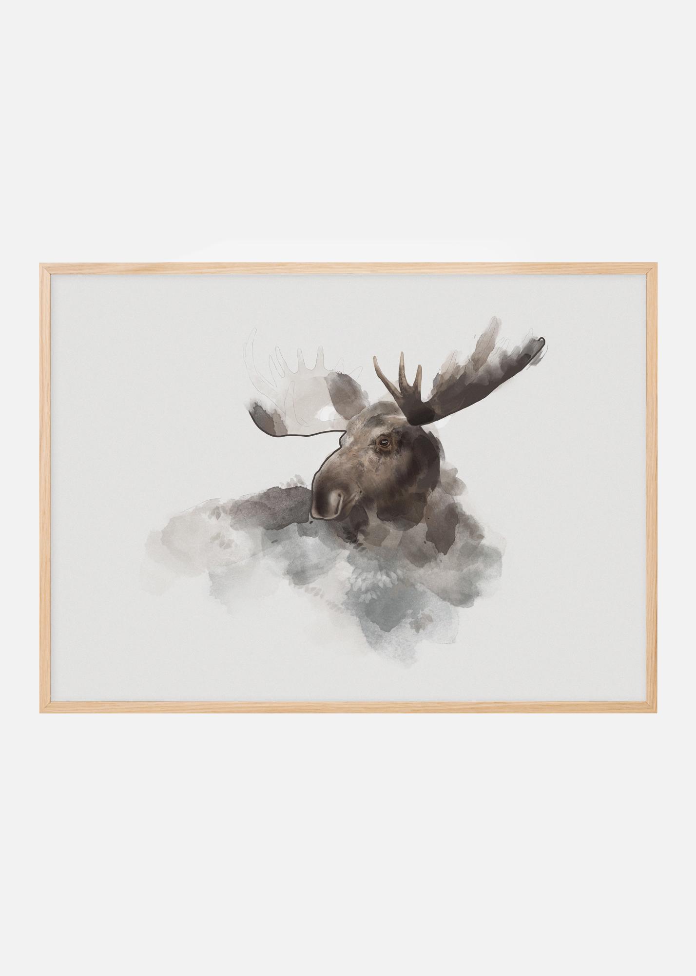 Akvarellplakat põdra peaga. Õrnad pintslitõmbed loovad järk-järgult põdra näo, tema sarved pole veel täielikult vormitud. Riputage see pilvetaoline pilt neutraalsele seinale, et säilitada oma kodu pehme elegants.