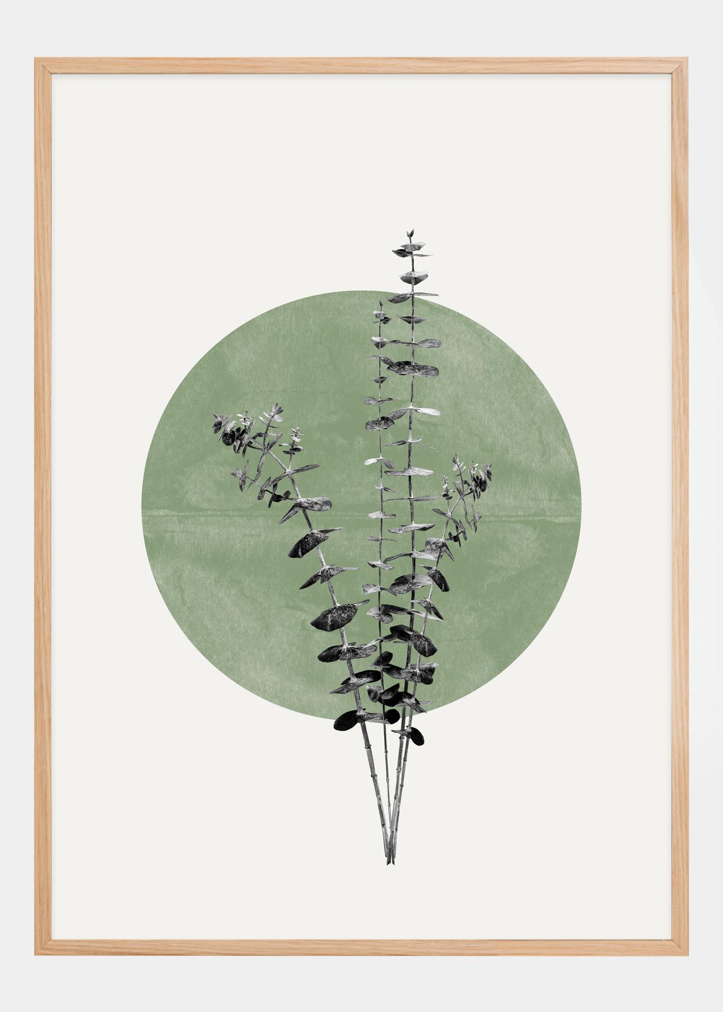 Eukalüpti graafiline kujutamine ja abstraktne roheline kuju annavad prindile orgaanilise, kuid siiski moodsa tunde. See motiiv sobib ideaalselt neile, kes otsivad kodus või töökeskkonnas looduse rahu puudet. Motivi värvid - pehme roheline ja must puhtal valgel taustal - pakuvad värsket paletti, mis täiendab nii kaasaegseid kui ka traditsioonilisi sisustusstiile.
