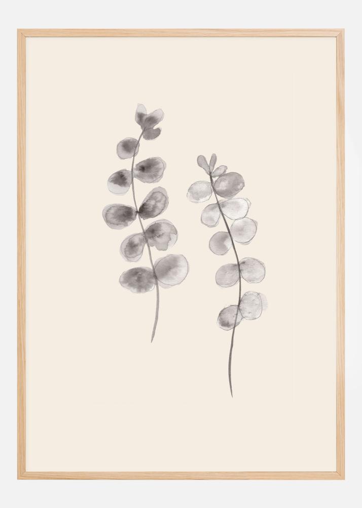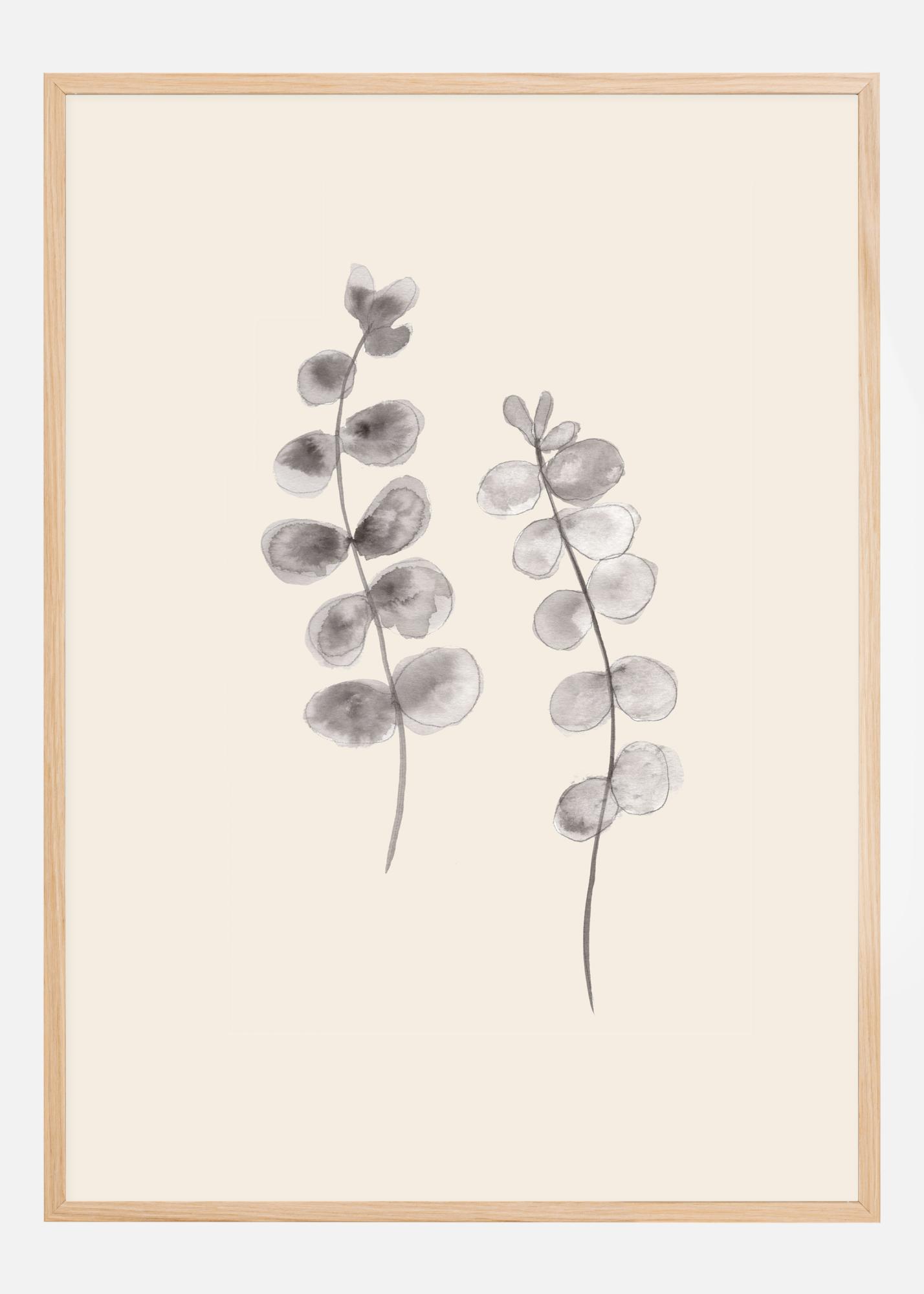 Botaaniline plakat kahe halli eukalüptioksaga. Valgel taustal on kaks halliks värvitud eukalüptioksa. Need painutavad end koos, et luua pehme kurv, mis juhatab pilgu plakatil ülespoole. Riputa see lopsakas tants oma koju rahustava tunde loomiseks.
