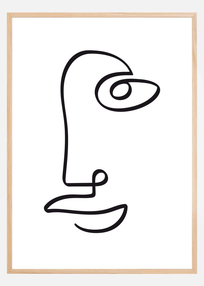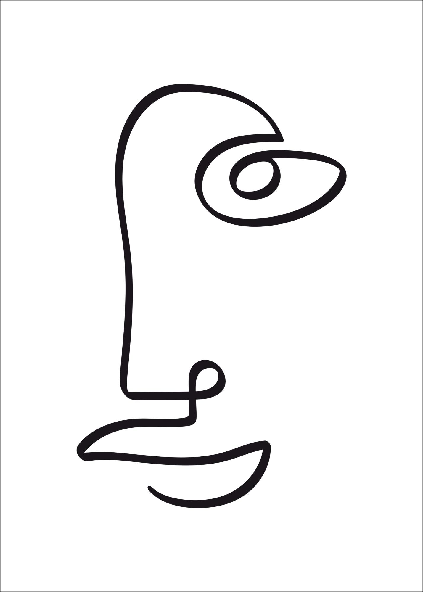 Abstraktne poster näoga, joonistatud musta joonega. Lihtne must joon keerleb pildil, et luua ühe külje nägu, ilma et kordagi paberit jätaks. Mediteeri selle lihtsa pildi üle, kui riputad selle koju, ja püüa näha teisi varjatud kujundeid kunstiteoses.