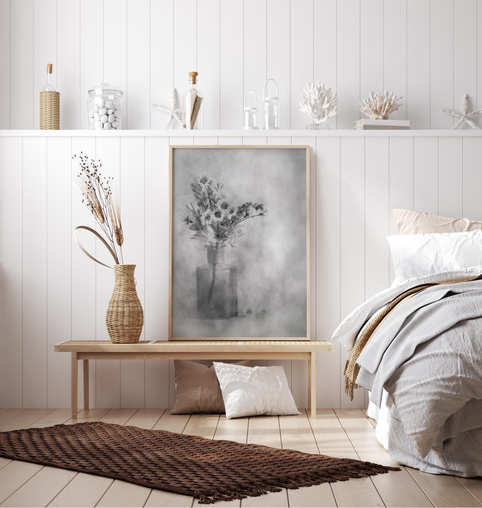Romantiline poster pehme natüürmordiga, millel on vaas ja lilled. See hallikas pilt on pehme maalitud tundega ja minimaalsete kontrastidega erinevate pildi osade vahel. Kujutage ette, et valmistute ise seda rahulikku stseeni maalima, kui riputate selle kodus pastelset värvi seinale.