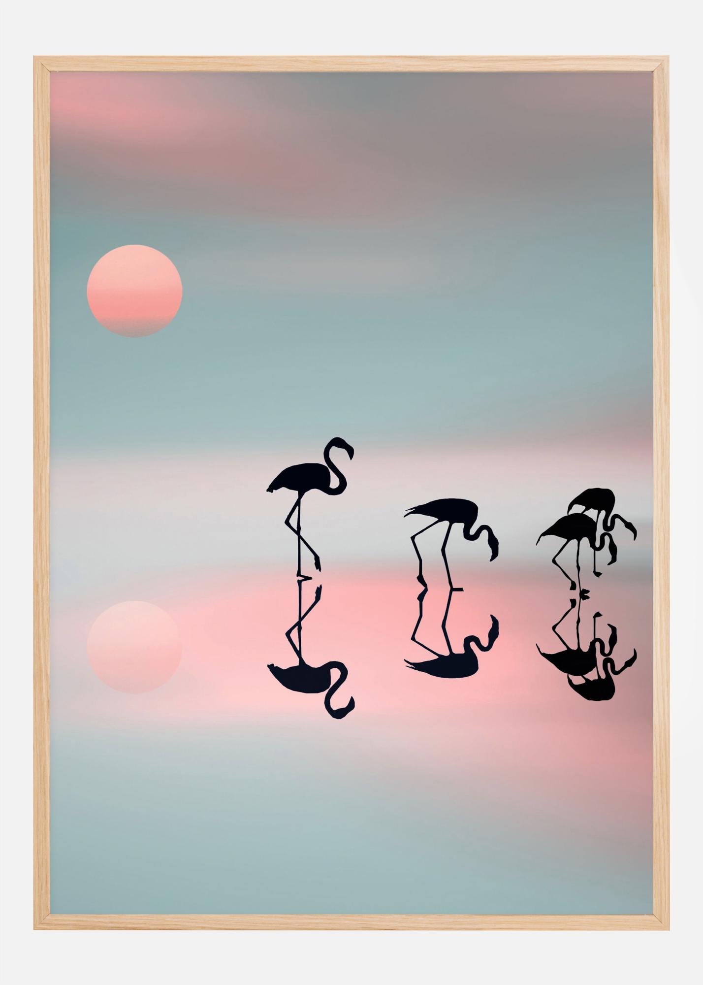 Elav plakat nelja flamingoga, kes söövad heledates pastelltoonides järve ääres. Sinine, roosa ja virsikuvärvi valgus loovad pehme pildi flamingopere siluetiga, kes ettevaatlikult üle järve kõnnib. Sa võid peaaegu tunda rahu selles pehmes, vaikses pildis.