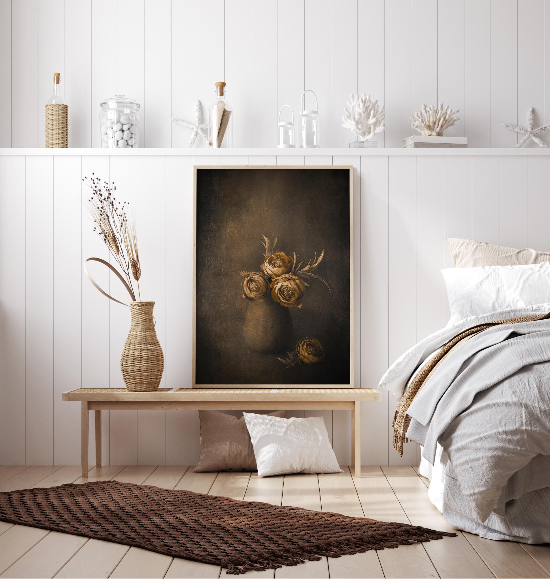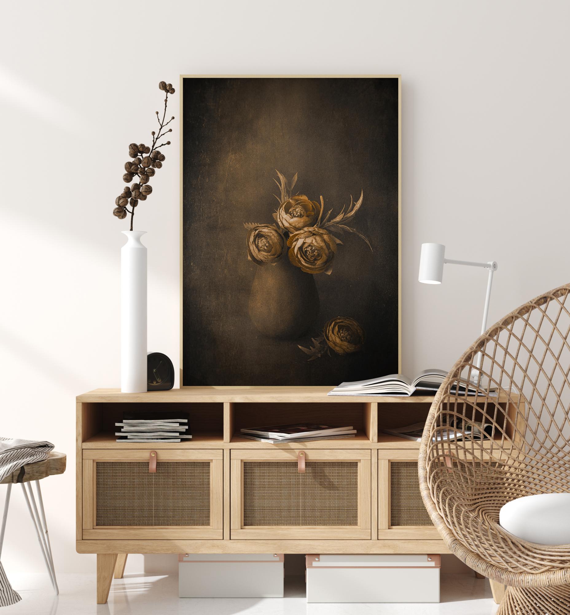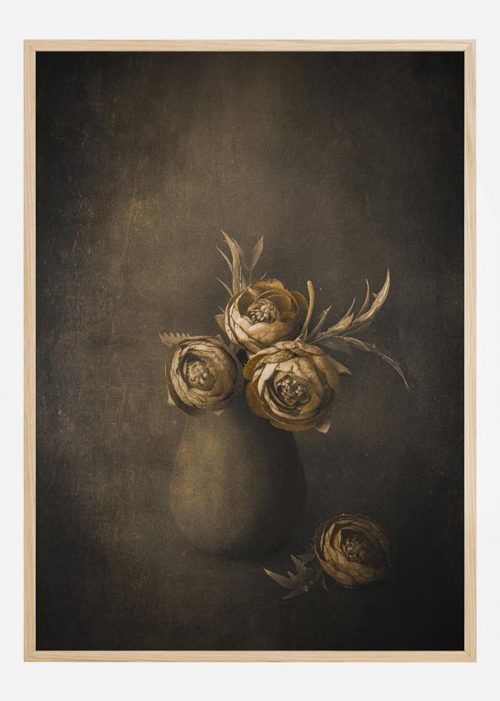 Natüürmortplakat kuldsete lilledega savikruusis tumeda tausta ees. Läikivad kuldkollased lilled paistavad silma maali tumedama pruuni seina taustal. Sobita see kreemivärvi seinaga, et tõsta lilli järgmisele tasemele.