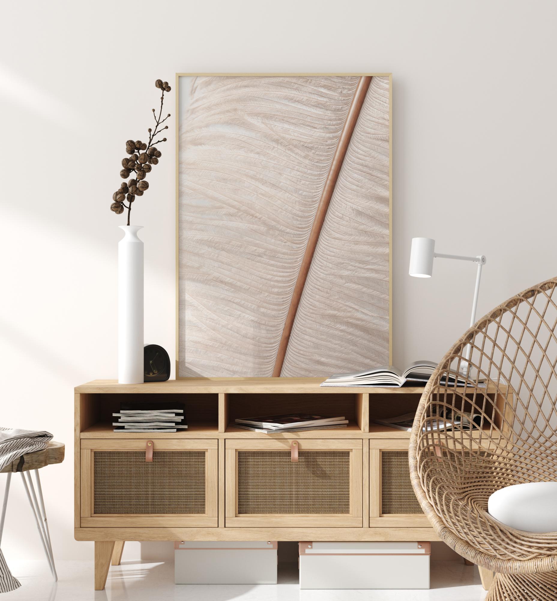 Makroplakat jaanalinnusule sulevõlliga. Selle suumitud pildi keskel on tugev keskne võll kõikide väikeste kohevate valgete sulgharudega, mis hargnevad sellest välja. Detailid on vapustavad sellel pehmel, kuid siiski muljetavaldaval plakatil. Sobitage neutraalse seina vastu, et saavutada pehme efekt.