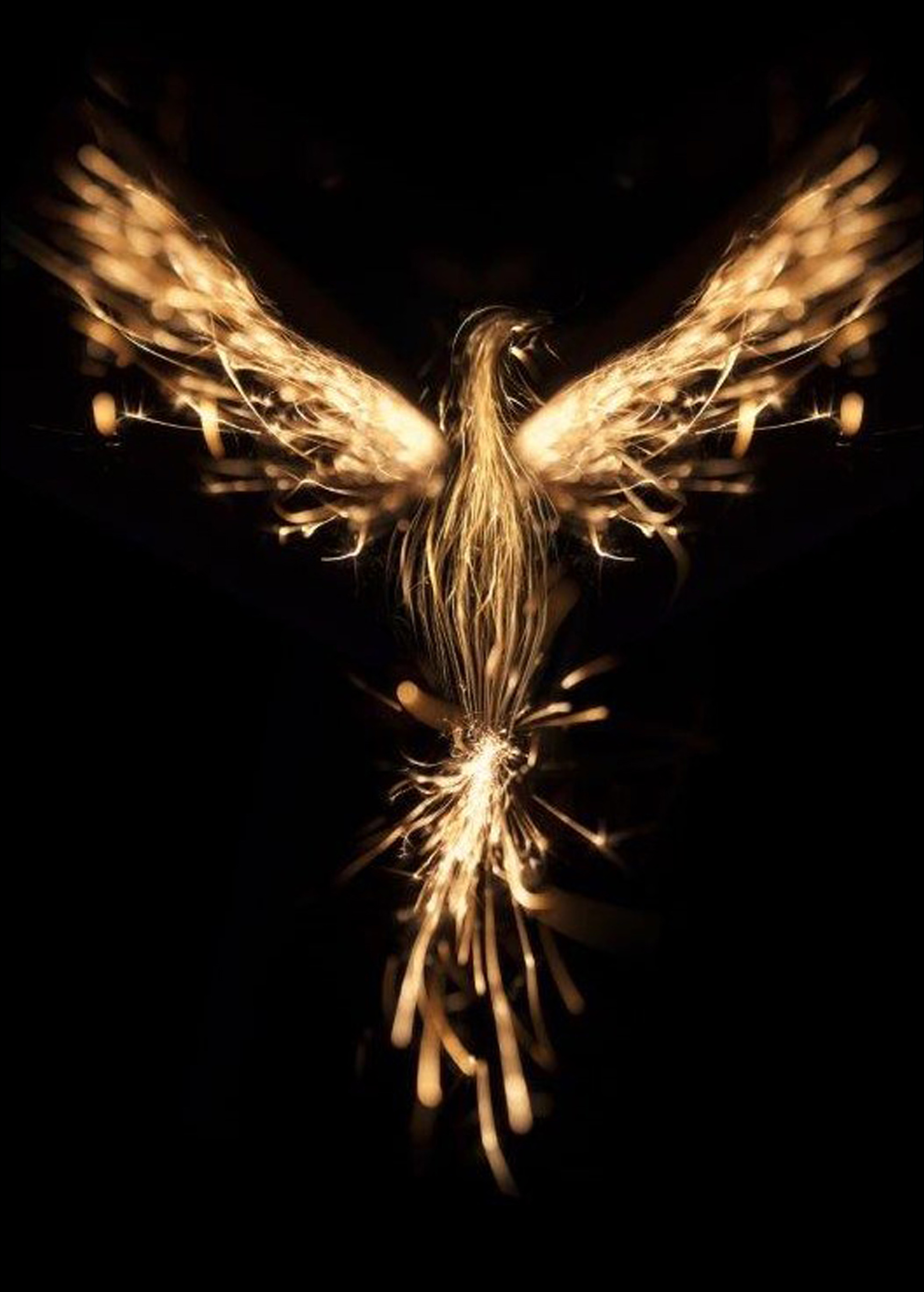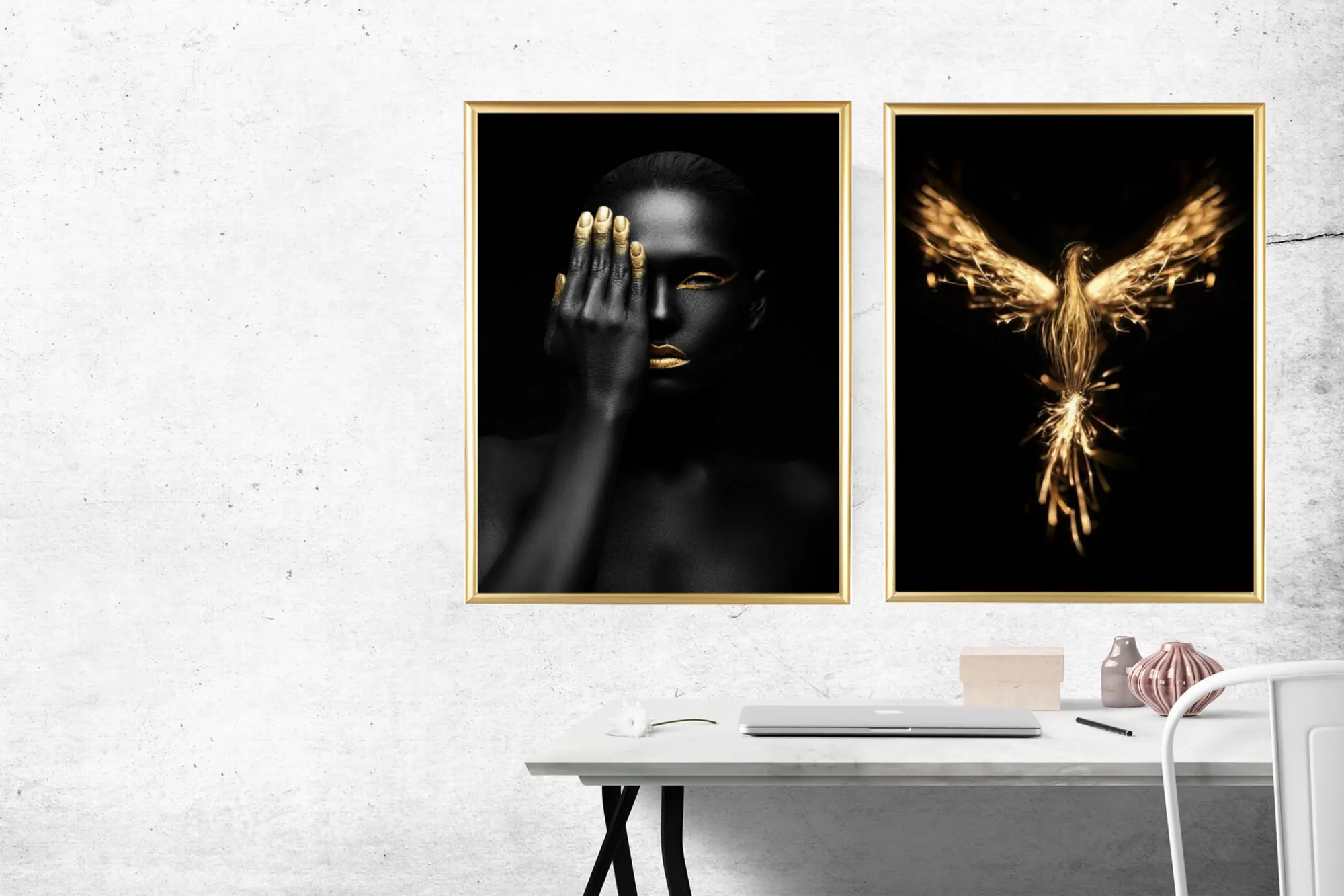 Graafilise kunsti kaudu vormib fööniks ilutulestiku kullavärvi toonides mustal taustal. Soe ja meeldiv poster minimalistlikus formaadis, sobib ideaalselt sobitamiseks teiste lemmikutega suuremas kollaažis.
