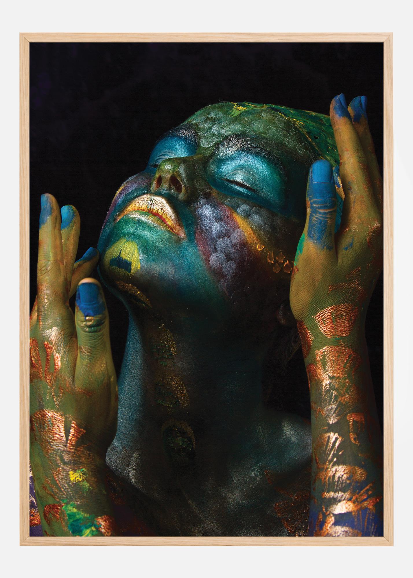 Mitmevärviline portreepilt naisega, kes kallutab pea tagasi ja raamib oma näo kätetega. Ta on kaetud helendavate, tugeva värviga, mis loovad ilusa segu metsikast värvikusest. Vali maalist üks värv ja sobita see oma seinal, et lisada väljendusrikkust.