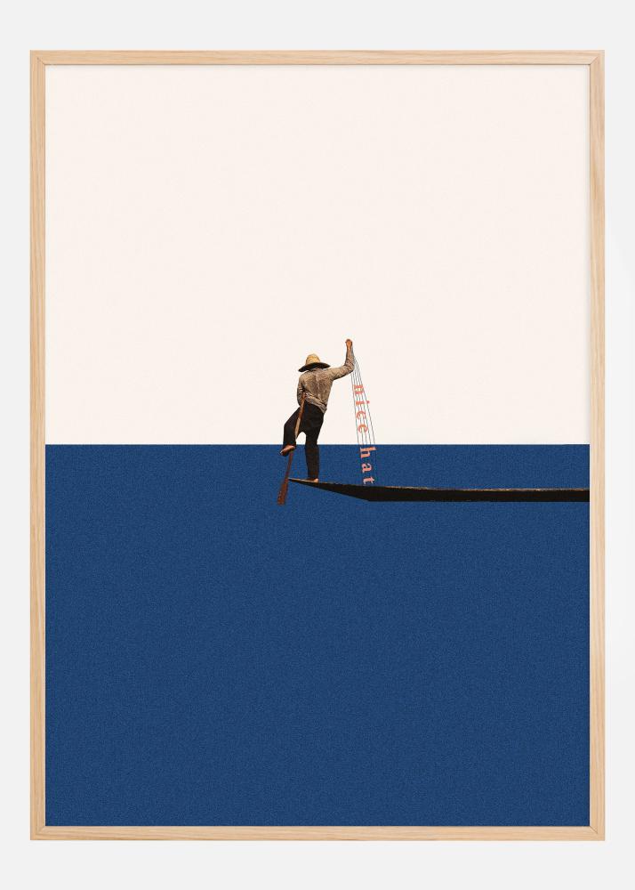 Selles loomingulises ja metafoorilises plakatil on jäädvustatud kannatlikkuse ja ootuse hetk. Siin on kujutatud meest, kes kannab klassikalist kalamehemütsi ja -jopet, seistes kindlalt pruuni paadi peal, mille taustaks on sügavat kontrasti pakkuv helesinine järv. Ta kaldub paadi äärest üle, olles süvenenud peenesse kunsti nimega "komplimentide püüdmine" elava punase ja valge õngega. See tegevus toob traditsioonilisse kalapüügiteemasse humoorika pöörde ja pakub kaasaegset tõlgendust kunsti kohta, kuidas otsida ja anda tunnustust.