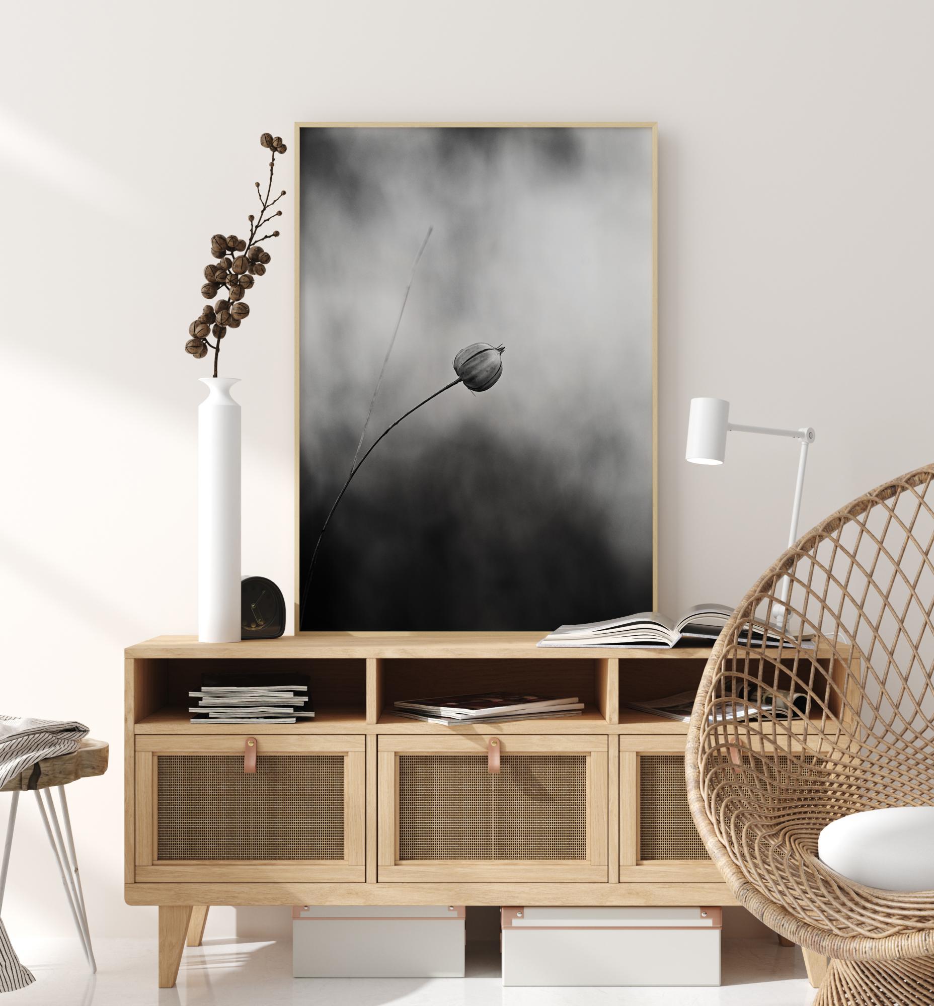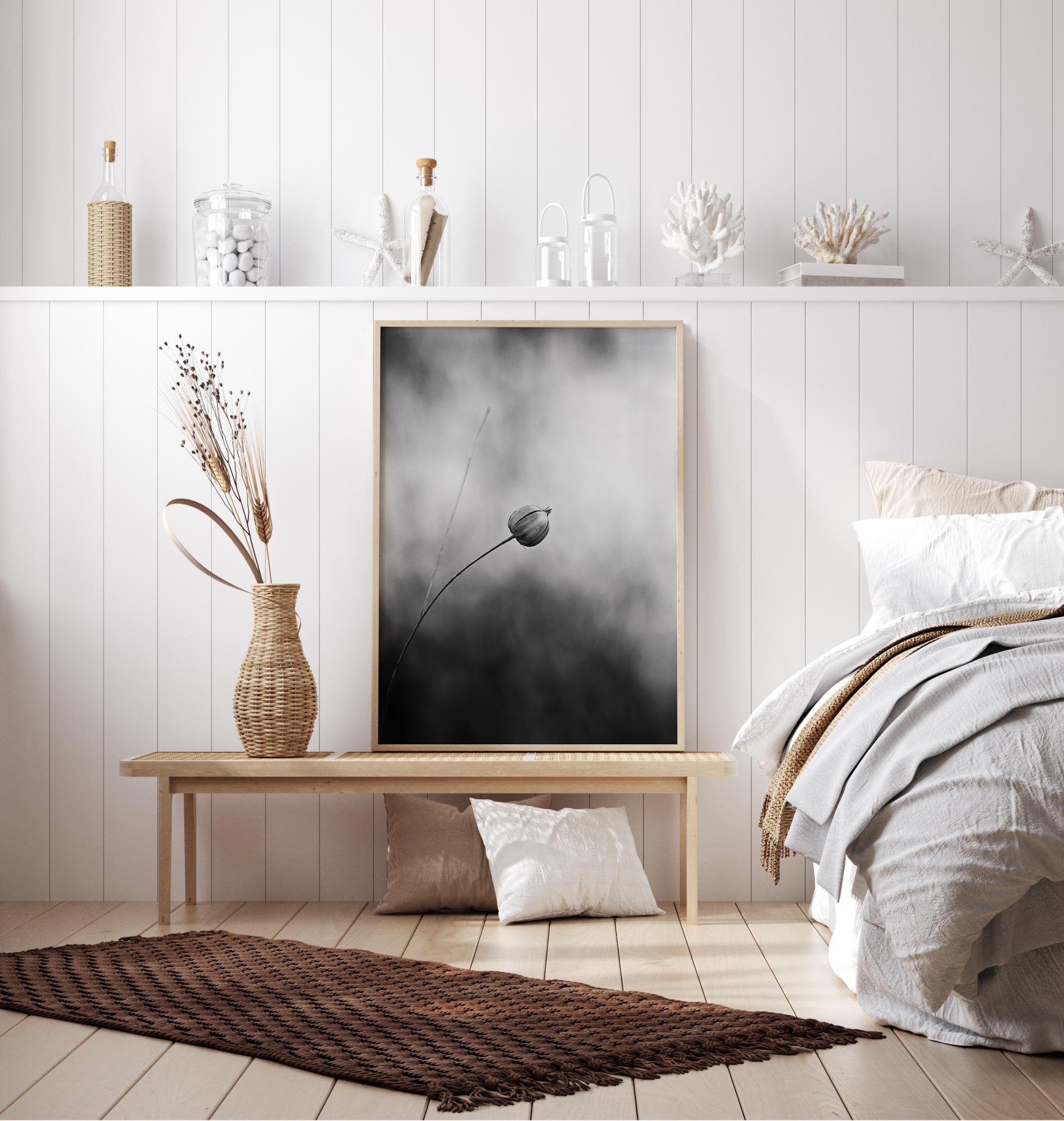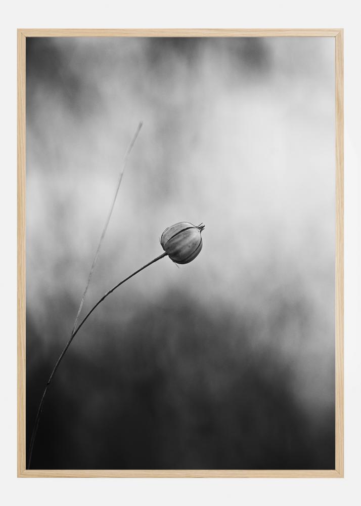 Mustvalge plakat, millel on kujutatud üks linataim pärast selle äraõitsemist. Lina paindub pildi keskosa poole, olles selgelt esile tõstetud valge valguse taustal. Allpool on taust tume ja fookusest väljas, et hoida tähelepanu ainsal lillel. Anna sellele teosele värvi foonseinaga.