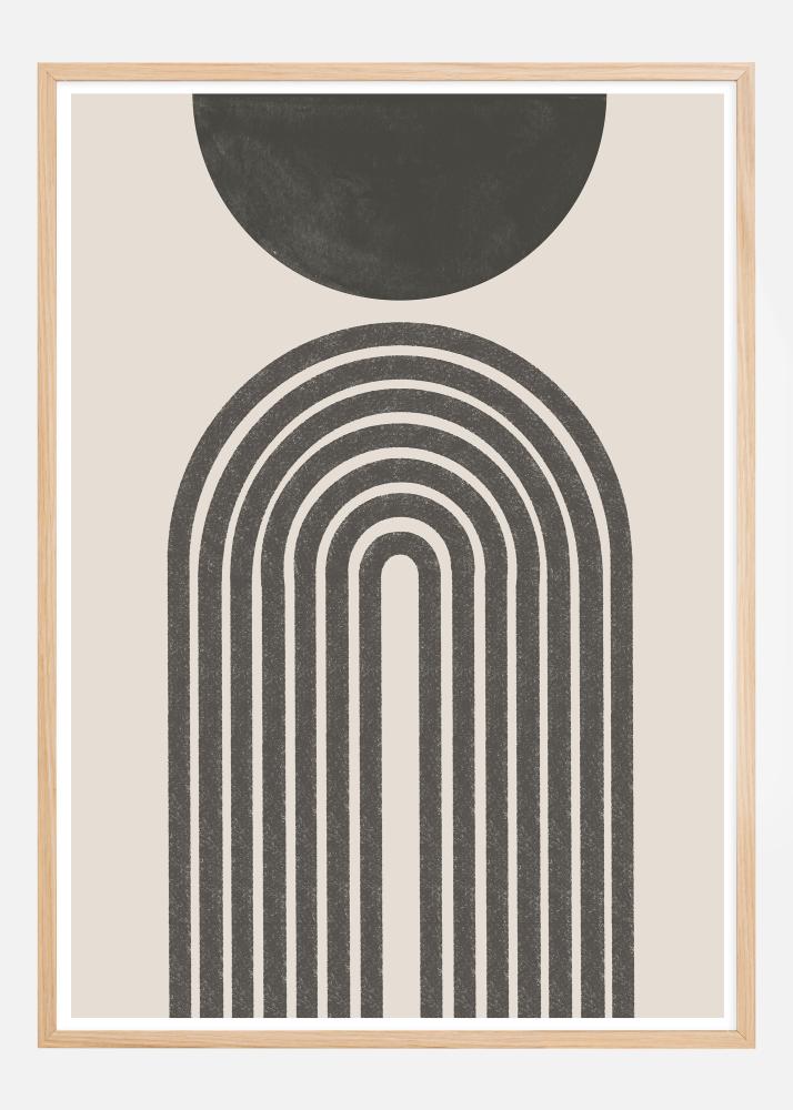 Selle kunstilise plakati kujundus näitab geomeetrilise täpsuse ja orgaanilise pehmuse ühtesulamist. Kujunduse ülemises osas on must poolring, mis kiirgab rahustavat kohalolu sooja, neutraalse tausta suunas. Selle all tõuseb rida musti kaari, mis moodustavad harmooniliselt portaalilaadse kuju, luues kontrasti range geomeetria ja musta ringi abstraktsete kõverate vahel. Lihtne värvilahendus musta ja off-white tausta vahel annab kaasaegse ja elegantse ilme, mis on ideaalne tänapäevases kodus või kontoris.