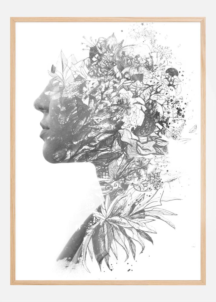 See kunstiposter ühendab naise profiili üksikasjaliku ja keeruka lillede ja taimede illustratsiooniga, luues inimfiguuri ja looduse peente detailide lummava sulami. Mustvalge värviskeem annab ajatu tunde ja toob esile nii inimfiguuri kui ka lillemotiivide peene tekstuuri ja keerukuse.