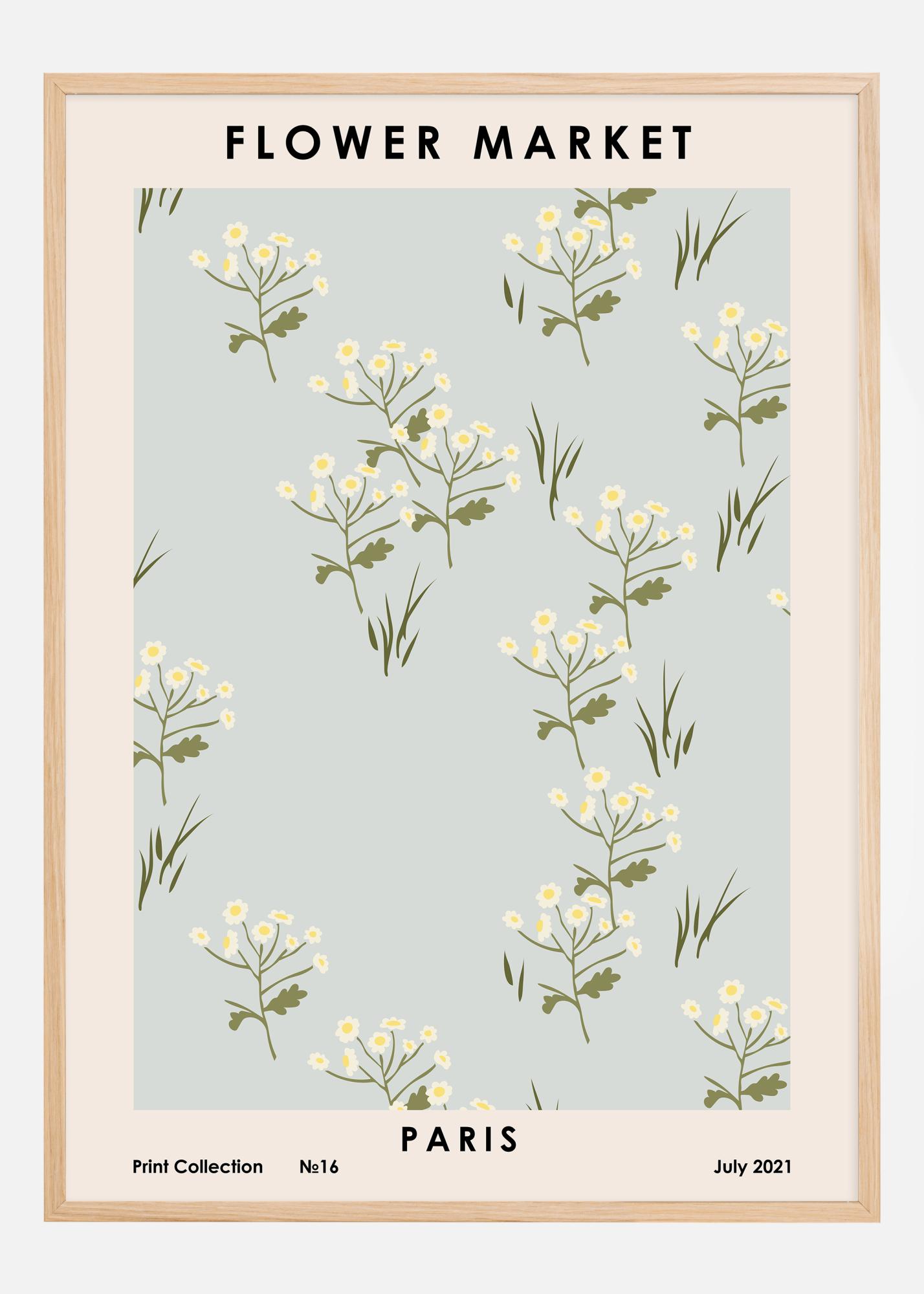 See võluv ja stiilne plakat viib teid otse Pariisi südamesse, kujutades lillemarketi pilti. See esitleb õrna valgete lillede mustrit rahustava hallika-sinise taustal, pakkudes värskuse ja lihtsa elegantsi tunnet. Üleval on tekst "FLOWER MARKET" klassikalises tüpograafias, samas kui allosas on tekst "Print Collection ?16 PARIS July 2021", mis lisab autentsuse ja kultuurilise konteksti tunnet.