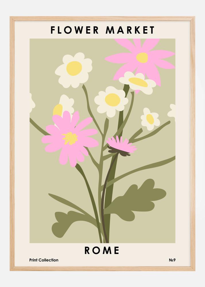 Koos valgusküllase ja kutsuva disainiga kujutab see plakat Rooma lillemarketi sooja ja elavat atmosfääri. Tähelepanu keskmes on detailid ja mänguline värvikasutus, suured roosad lilled, mida täiendavad õrnad valged õied, kõik rahustava oliivrohelise taustal. See print on ideaalne, et tutvustada Rooma igavese linna tunnet ja selle armastust ilu ja looduse vastu sinu ruumi.