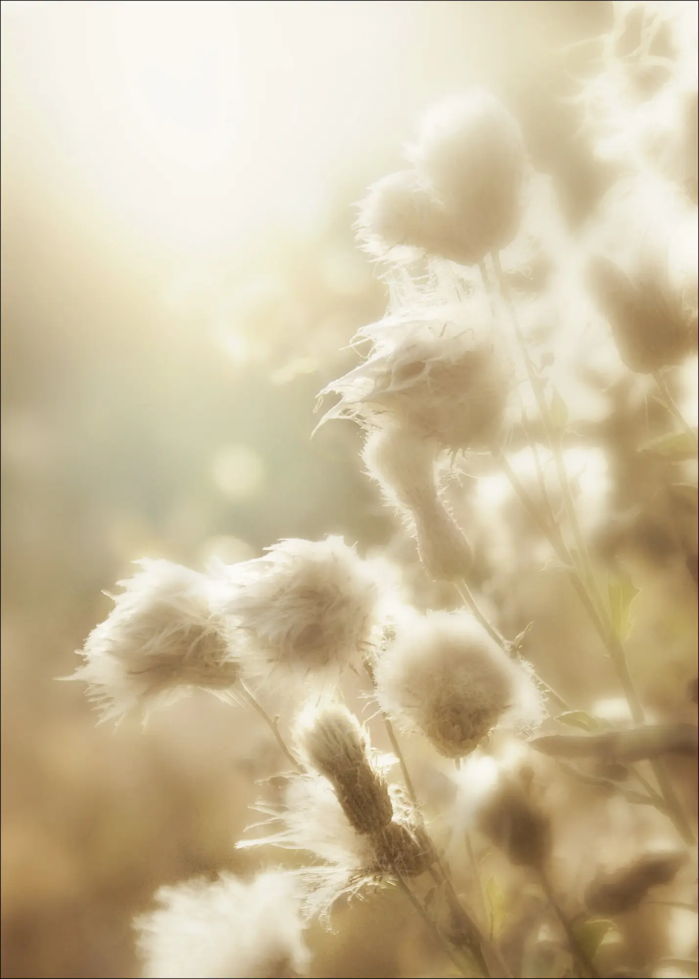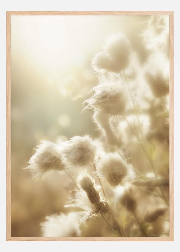 Võluv plakat kohevatega lilledega varahommikuses valguses. Lillede pehmed pallid on valgustatud hommikuvalgusega, mis loob iga lille ümber inglioreooli. Pehmed pastellvärvid aitavad luua unise, võluva tunde õrnast ärkamisest.