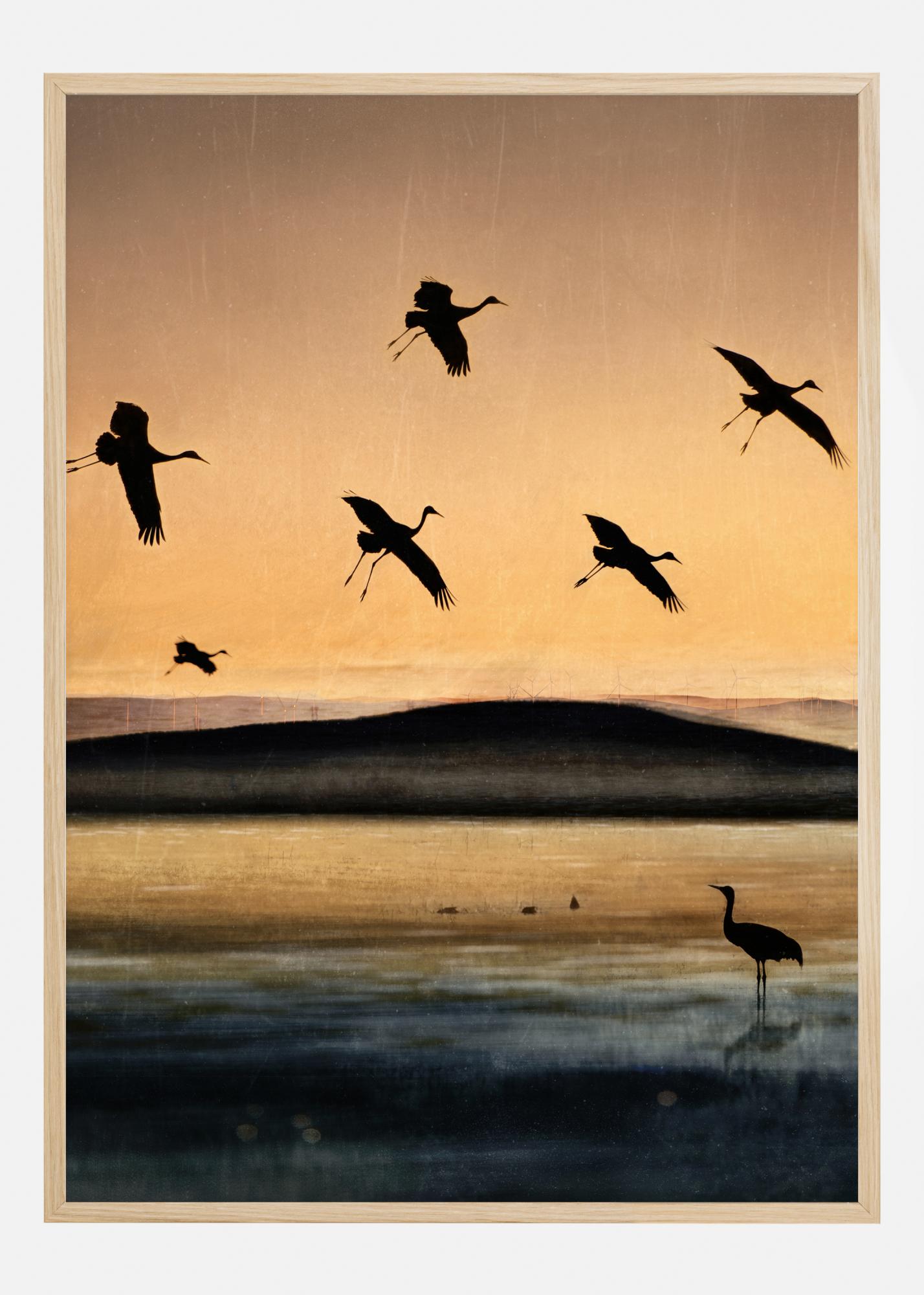 Meeleolukas plakat lindudega, kes lendavad päikeseloojangul. Kuus toonekurge tõusevad lendu, nende siluetid on teravas kontrastis oranži taeva ja loojuva päikesega. Üksik lind seisab sinises ja kuldses järves ja vaatab ülejäänud lennukeid, kui need minema lendavad. Tunne lendamise rahu sellel soojal plakatil.