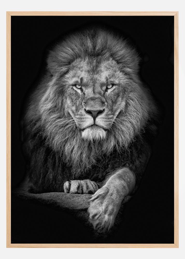 Mustvalge lähivõte lõvist, kes vaatab otse pealtvaatajale. Tume taust ja intensiivne pilk loovad suurepärase tõmbe maalile. See on plakat, mis sobib sama hästi üksi kui koos teiste lemmikutega suuremas kollaažis.