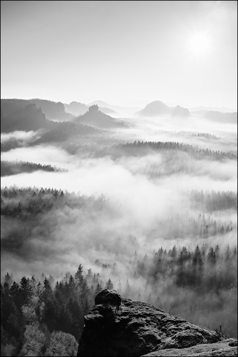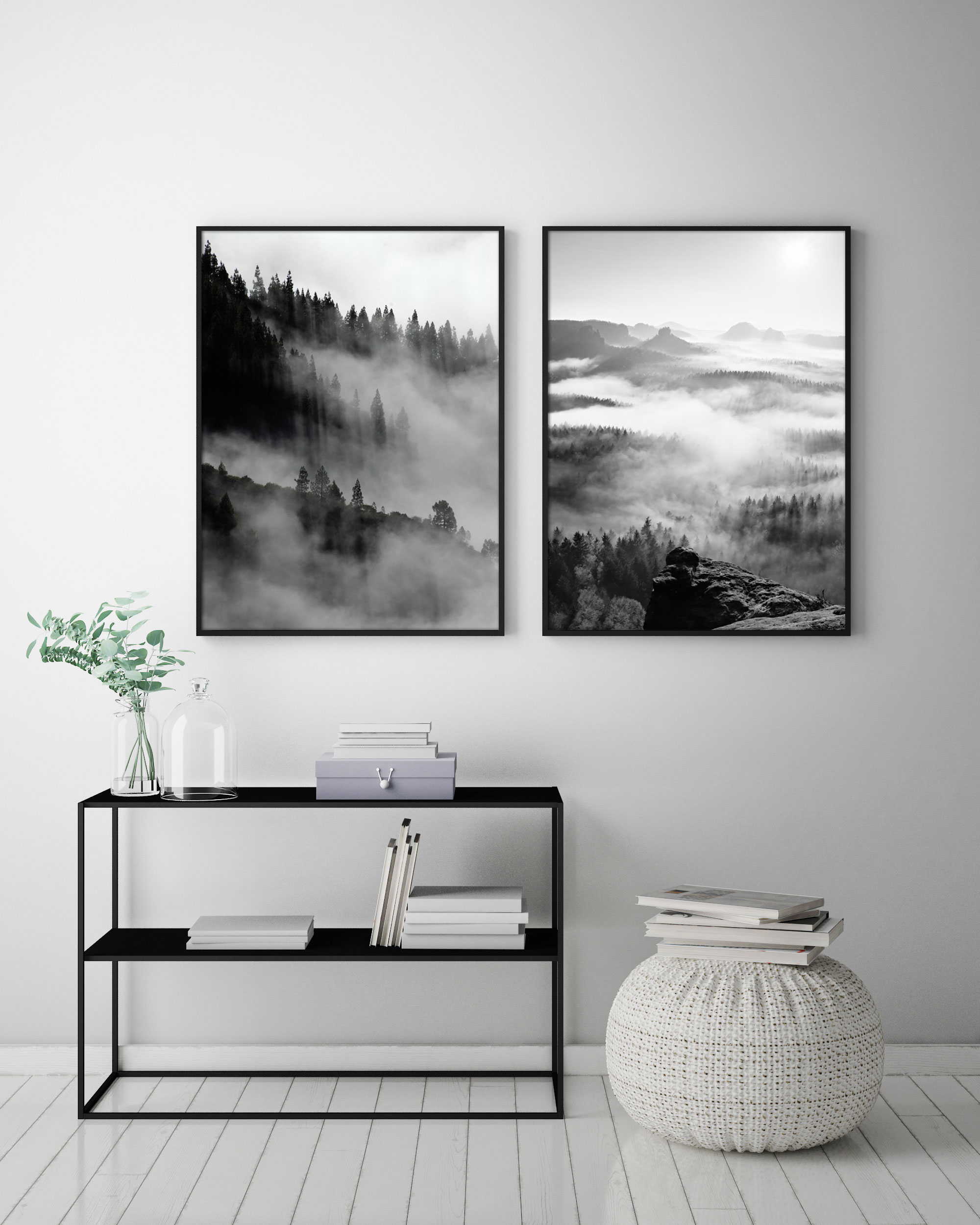 Mustvalge foto kuuskedega kaetud mägimaastikust, mille motiiviks on udu. Pildi sügav perspektiiv, vaatluspunkt kõrgel puude kohal, annab plakatile dramaatilisuse tunde. Foto sobib võrdselt hästi koju kui ka avalikku keskkonda riputamiseks, olles stiilne igasugustes sisekujundusstiilides. Täiendage kauni pildiraamiga, mis toob motiivi hästi esile ja sobib kokku ülejäänud sisustusega toas, kuhu maal riputatakse.