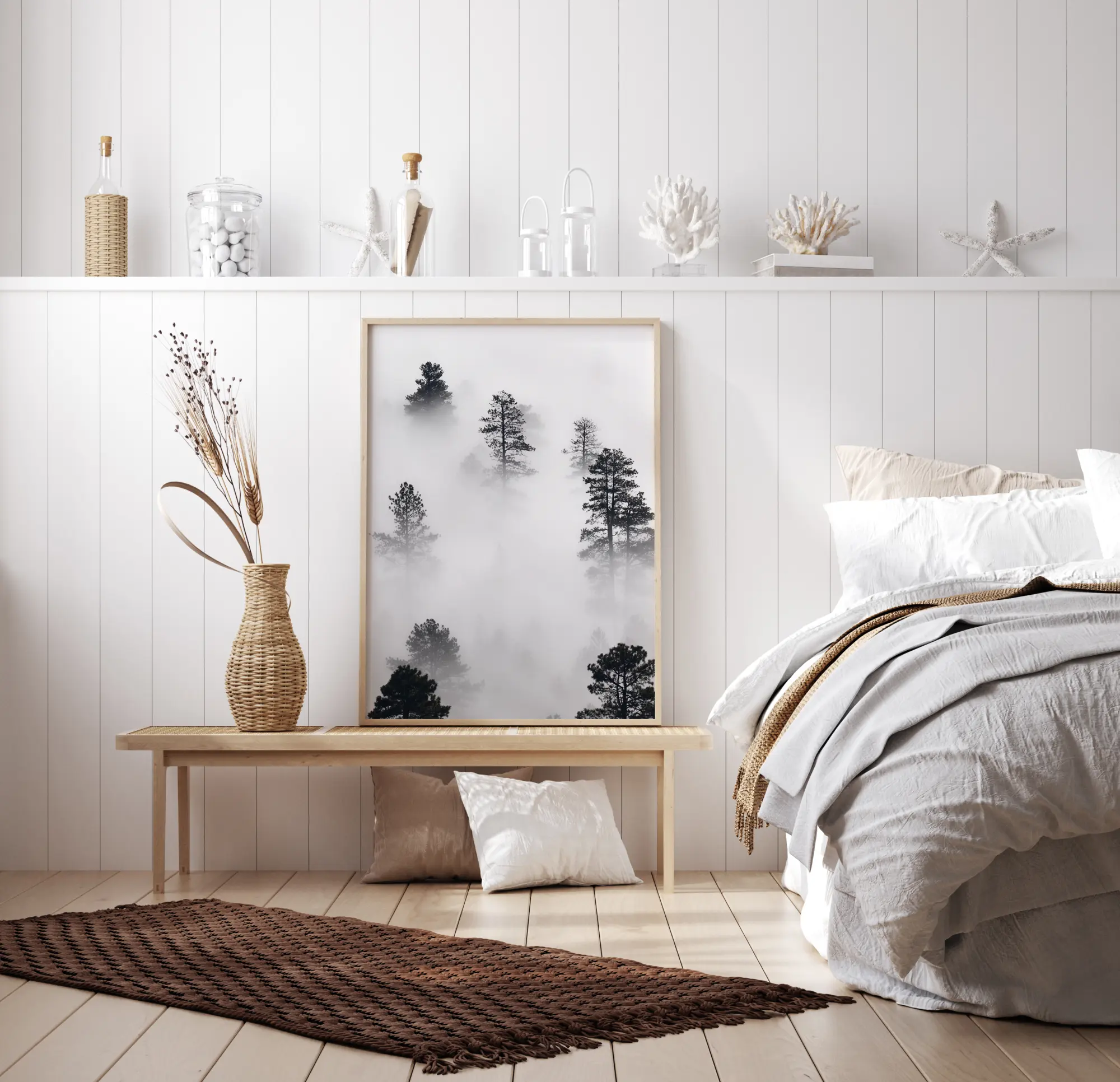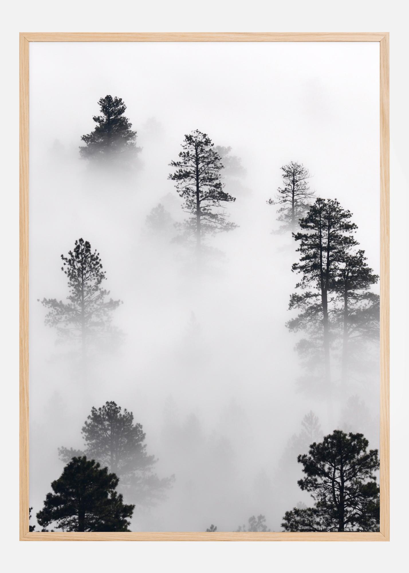 Suurepärane maastikuposter uduse metsaga. Kõrged tumedad puulatvad ulatuvad kahvatust valgest udust välja, luues tugeva kontrasti udu ja puude vahel. Too see jahe talvetunne oma koju, riputades see neutraalsele seinale.