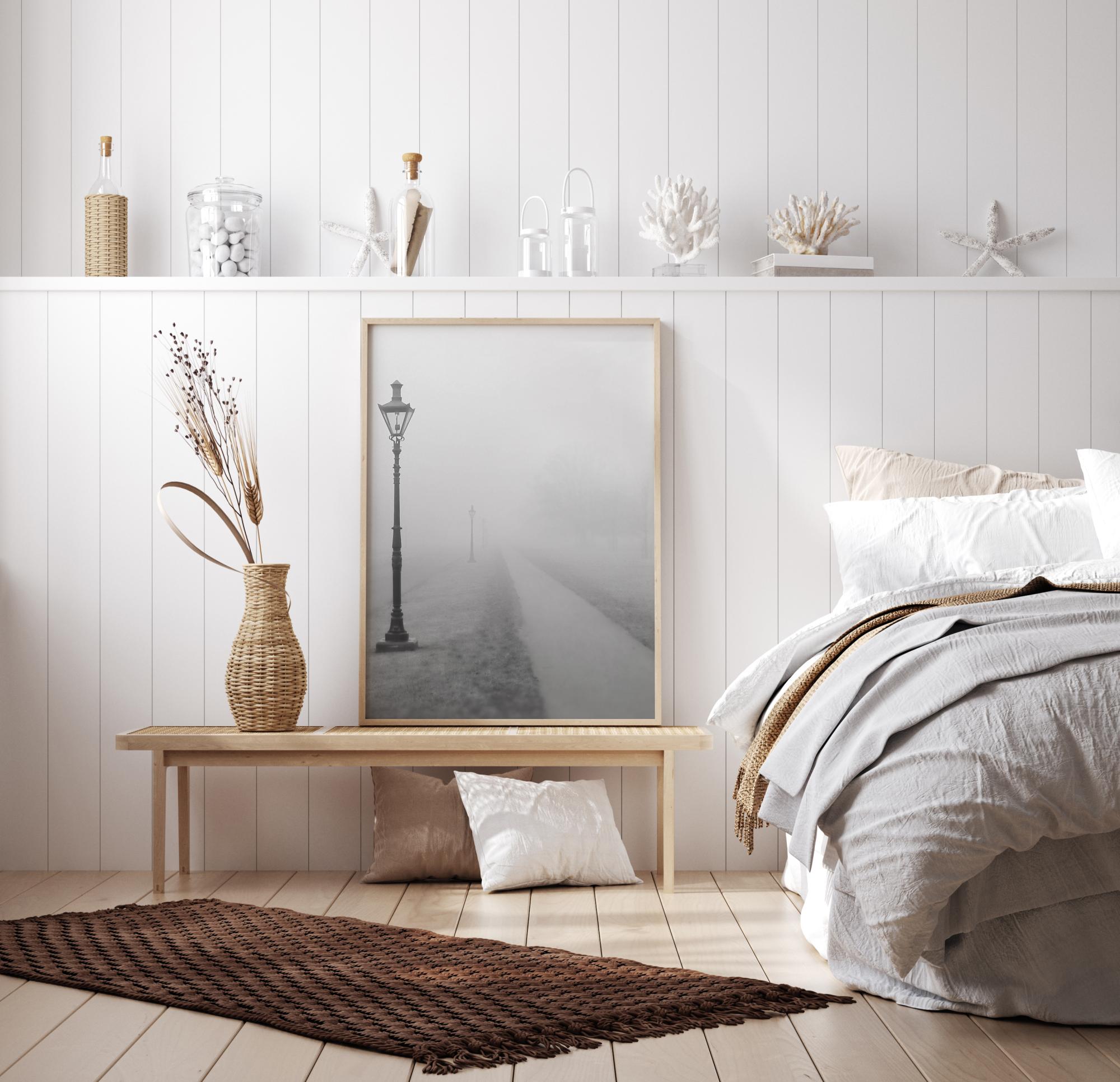 Linnalik plakat udune tänavaga. Vanamoodsad tänavalaternad järgivad üksildast teed, mis kaob kaugusesse udusse. Selles peenes fotos on kummaline rahu, mis toob endaga kaasa ka talvekülma tunde. Säilitage selle foto tunne, riputades selle valgele seinale.