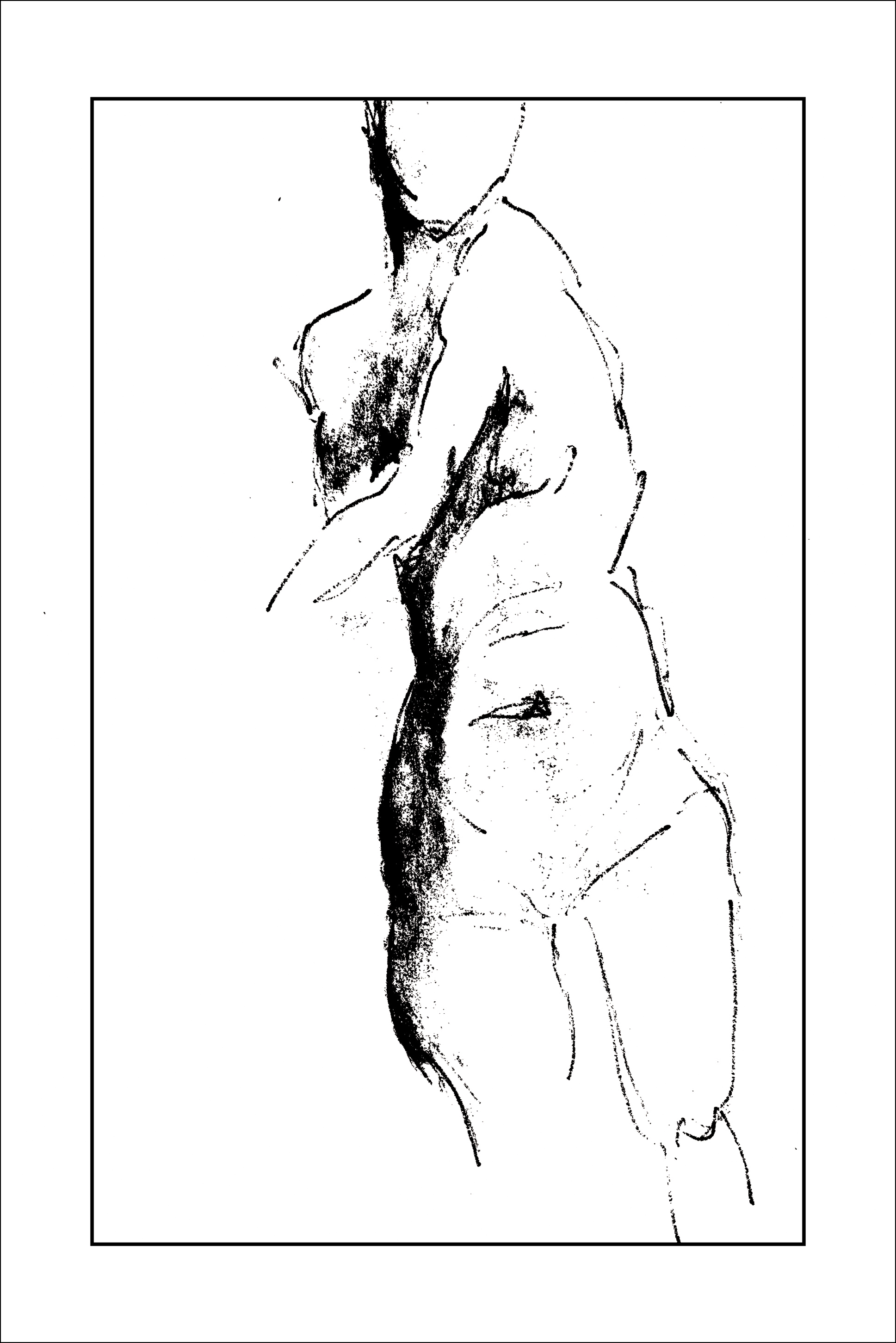 Joonistuspilt, millel on alasti naine, kes pöörab end ringi. Selle pildi joonistatud stiil aitab luua liikumise tunnet, kui modell pöördub ja sirutab käed üle rindkere. See mustvalge pilt näeb värvikireva seina peal suurepärane välja.