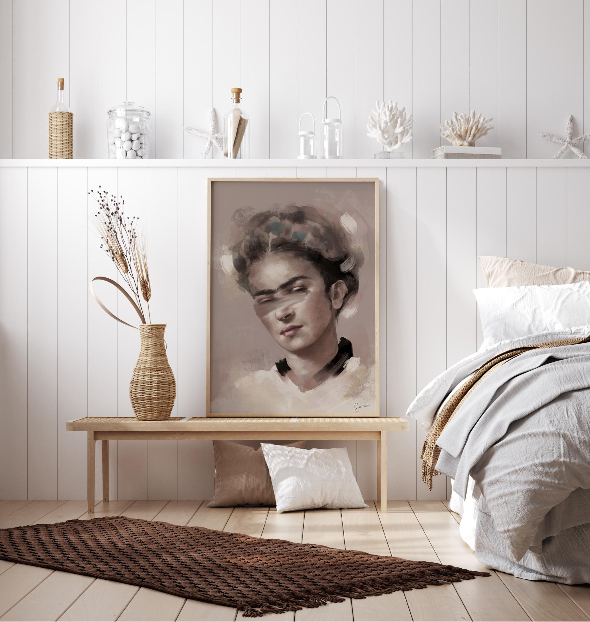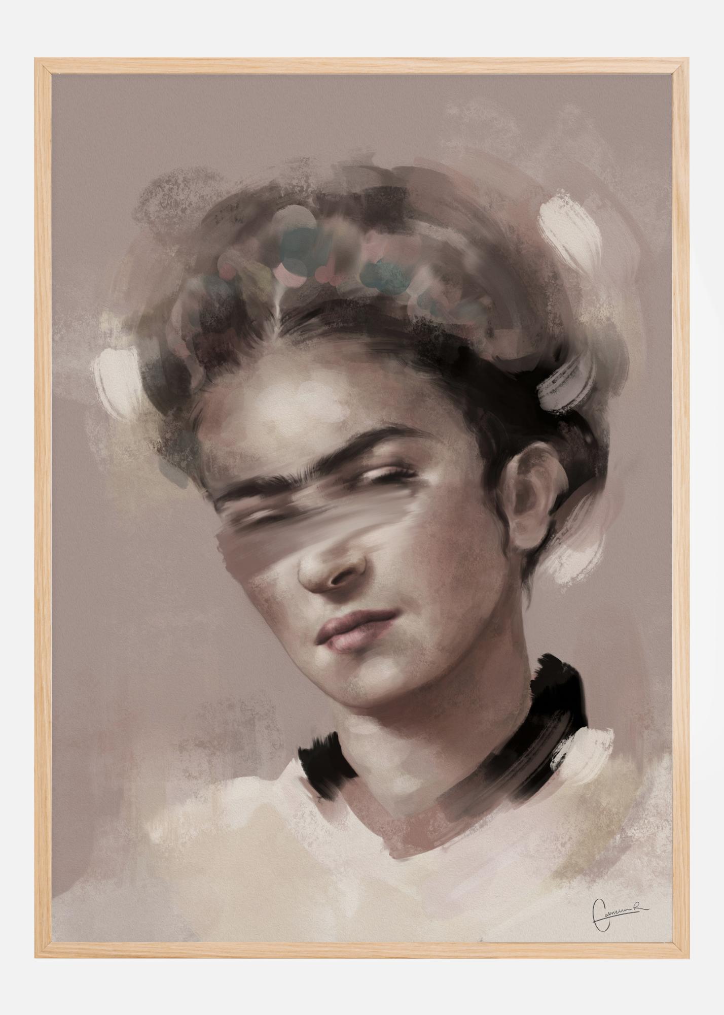 Portreeplakat Frida Kahlost pehmetes värvides. Rahulik ja vaikne, see naine vaatab alla rahuliku ilmega. Tema juuksed ja nahk on pehmetes neutraalsetes toonides, mis lisavad peaingelliku tunde, mida ta edasi annab. Näita oma lemmikkunstnikku selle trükisega.