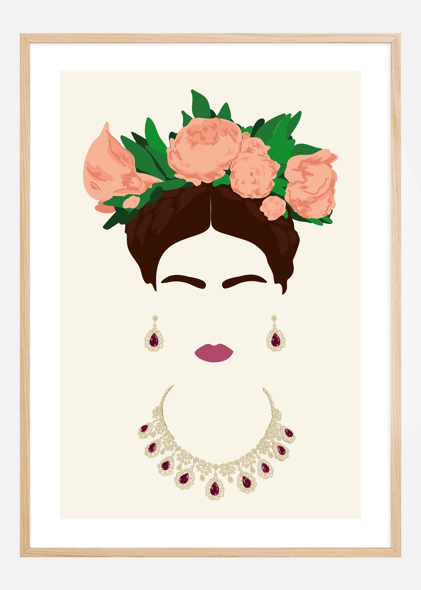 Sellele lisanduvad dekoratiivsed detailid, nagu kuldsed kõrvarõngad veinpunaste vääriskividega ja sobiv kaunistatud kaelakee, mis täiendavad tervikut. See plakat on austusavaldus nii traditsioonilisele ilule kui ka kaasaaegsele disainile, muutes selle võimsaks väiteks igas ruumis. Selle esteetika ühendab soojad toonid ja lihtsa graafika, et luua kutsuv ja meeleolu loov kunstielamus.