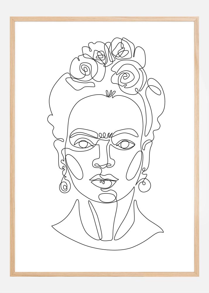 See minimalistlik plakat kujutab stiilset naisekuju joonistust elegantselt, kaunistatud lilledega juustes ja klassikaliste kõrvarõngastega. Kunstiteos on kujundatud ühe pideva joonega, mis annab traditsioonilisele portreele moodsa pöörde. Värvipalett on puhas ja lihtne, piirdudes mustade joontega valgel taustal, pakkudes kergendatud tunnet, mis sobib hästi kaasaegsesse või minimalistlikku koju.