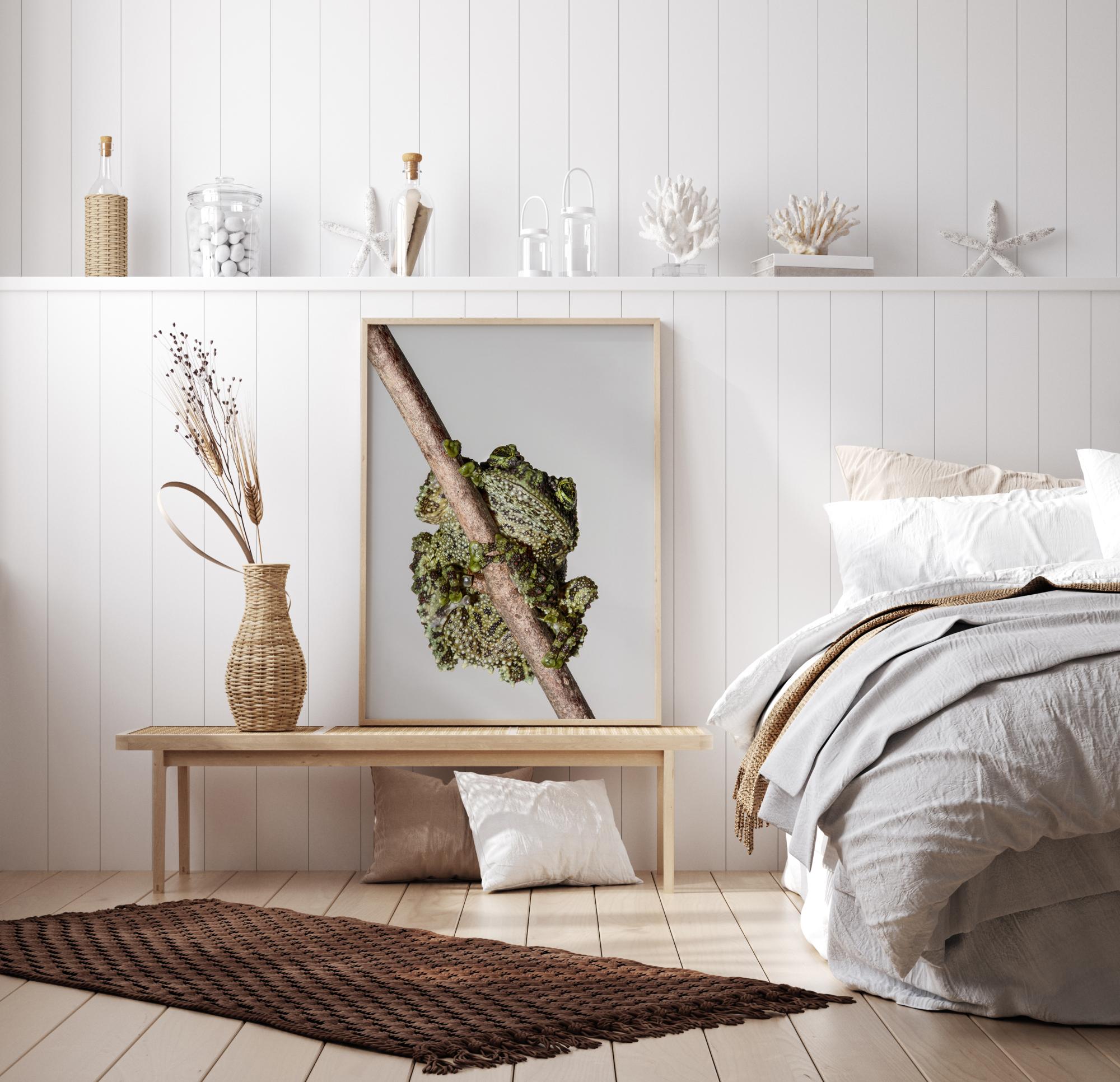 Makroplakat konnaga puu otsas kahvatusinise taeva taustal. Kõik konna muhkude, tüügaste ja kõige muu detailid on selgelt näha, samal ajal kui ta klammerdub õhukese oksa külge. Silmad ja suu vaatavad oksa kohale armsas ja võluv pildis, mis tunneks end koduselt mis tahes seinal.