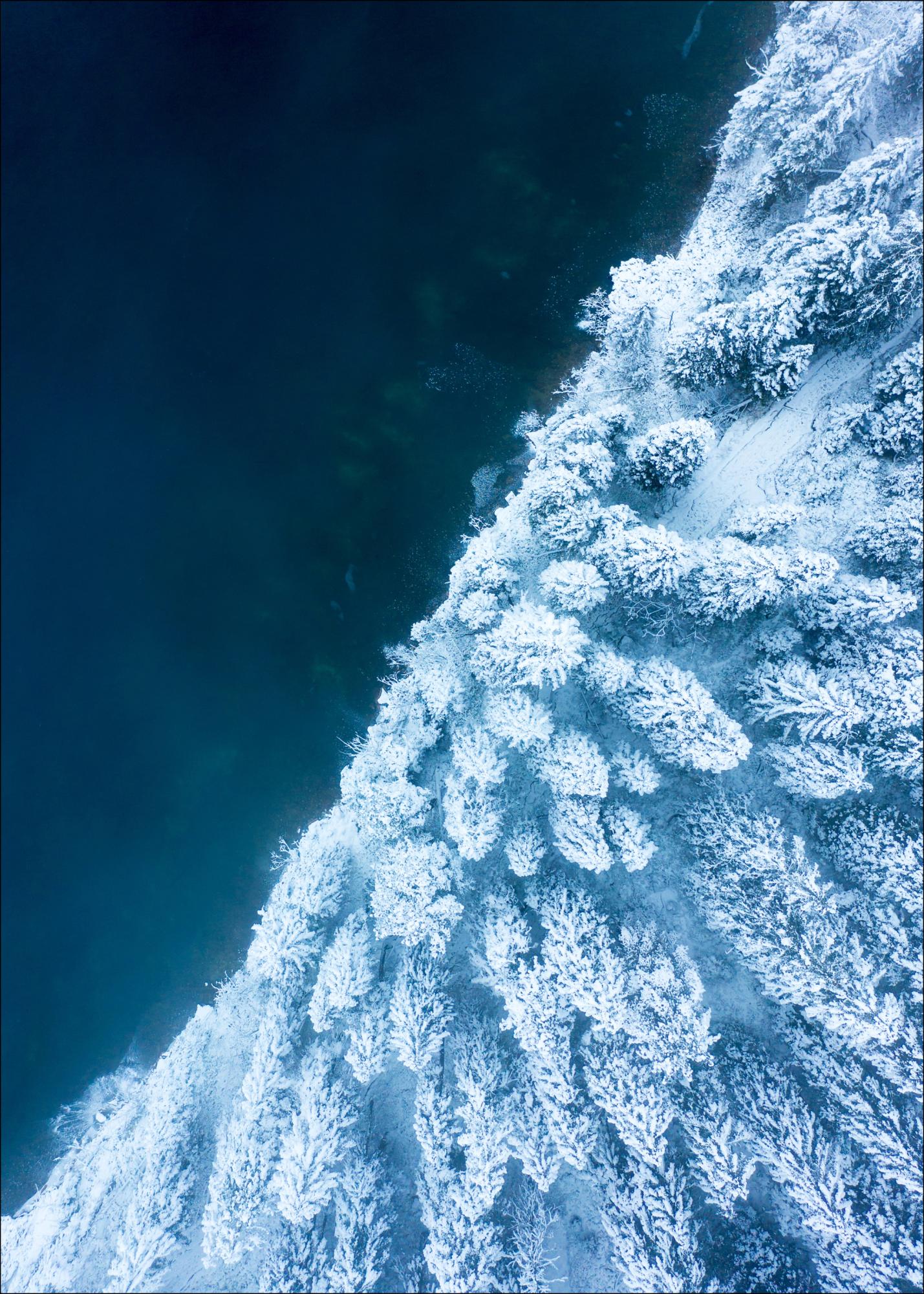 Põnev fotoposter linnulennult, kus lumega kaetud mets kohtub sinakasjääs merega teravas diagonaalis. Kaunis looduse plakat külmades toonides, ideaalne osana suuremast kollaažist.