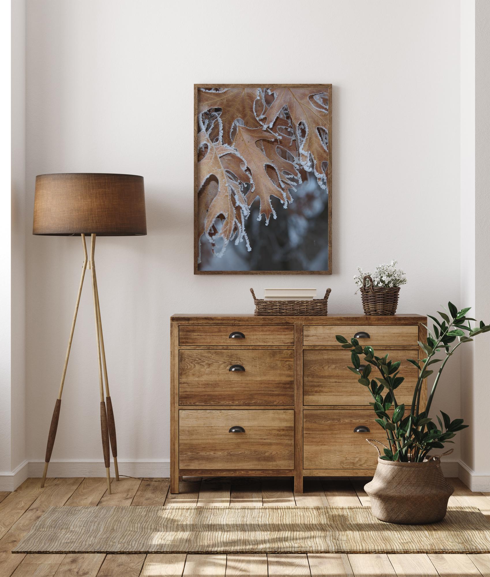 Makroplakat sügislehtedega, kaetud härmatisega. Pruunid ja kuivanud lehed tõmbuvad külmas kokku, igaühel on külmapiir väikeste jääosakestega, mis loovad omamoodi kaunistuse. Tunda saab jäist külma, kui riputate selle üles.