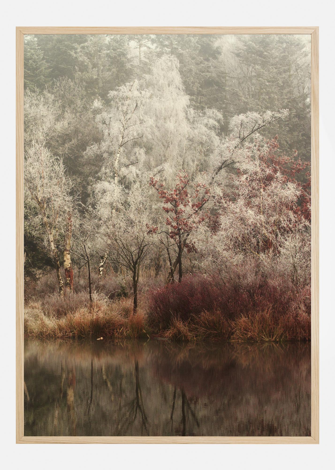 Tasane ja vaikne plakat külmunud metsamaastikuga. Esiplaanil asub selge ja vaikne järv, mille ees on tumepunane rohi ja tagaplaanil härmatistega kaetud puud. Sa võid peaaegu tunda vaikust ja rahu, mida see kaunis, maagiline pilt õhkab.