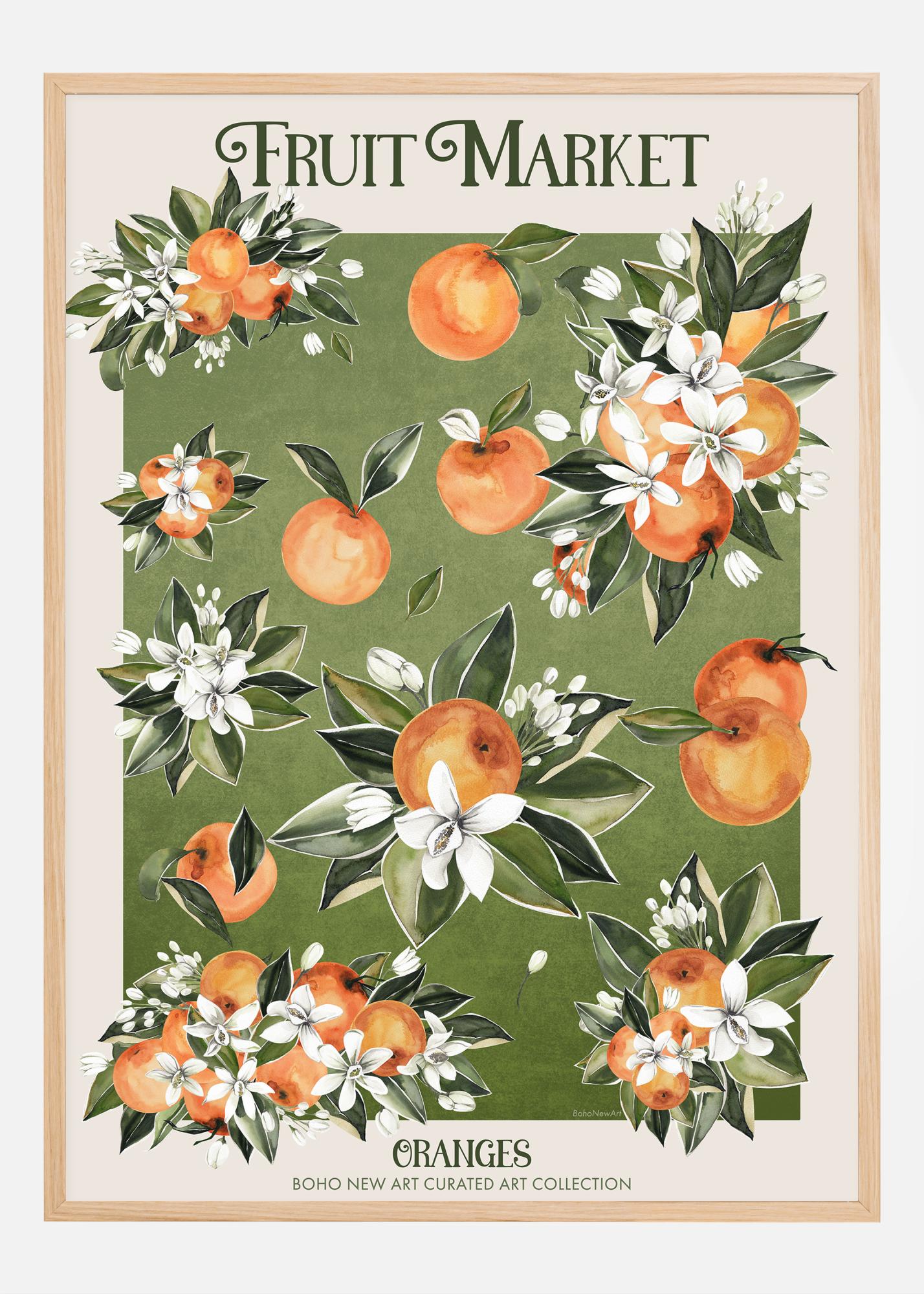 Taust sügava oliivrohelise värviga täiendab puuviljade elavaid oranže ja lillede pehmeid valgeid, andes disainile värskuse ja loomulikkuse tunde. Plakat kuulub "Boho New Art Curated Art Collectioni" ja on stiilne sisekujunduselement, mis sobib ideaalselt kööki või söögituppa, kus see võib innustada kulinaarseid seiklusi või lihtsalt lisada suve tunnet kogu aasta jooksul.