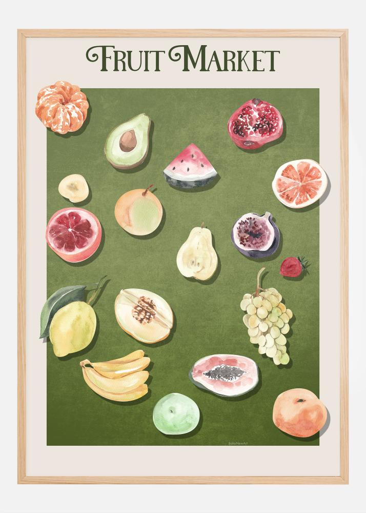 See värvikas plakat tabab elava puuviljaturu olemust ja on suurepärane täiendus meie sisustuskunsti kollektsioonile. Prinditud teos on silmale rõõmuks, esitades mahlaste puuviljade rea rikkaliku rohelise tausta vastu, luues värskuse ja külluse tunde. Alates päikeseküpsetest tsitrusviljadest kuni eksootiliste avokaado ja granaatõunani, pakub see teos visuaalset pidu, mis nii inspireerib kui ka rikastab. Iga puuvili on kujutatud detailitäpsusega, mis toob esile nende ainulaadsed tekstuurid ja vormid, muutes selle plakati kohustuslikuks kõigile, kes hindavad loodustruud kunsti.