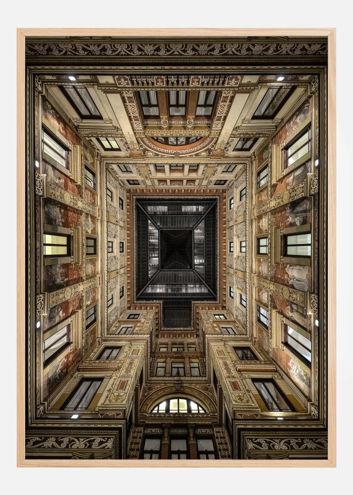 Interjööri plakat Galleria Sciarra'ga ja selle fantastilise arhitektuuriga. Kujutle, et oled hoones, vaatad üles lakke ja näed fantastilist akende ja keeruka mustrite valikut. Võta see reis endaga koju.
