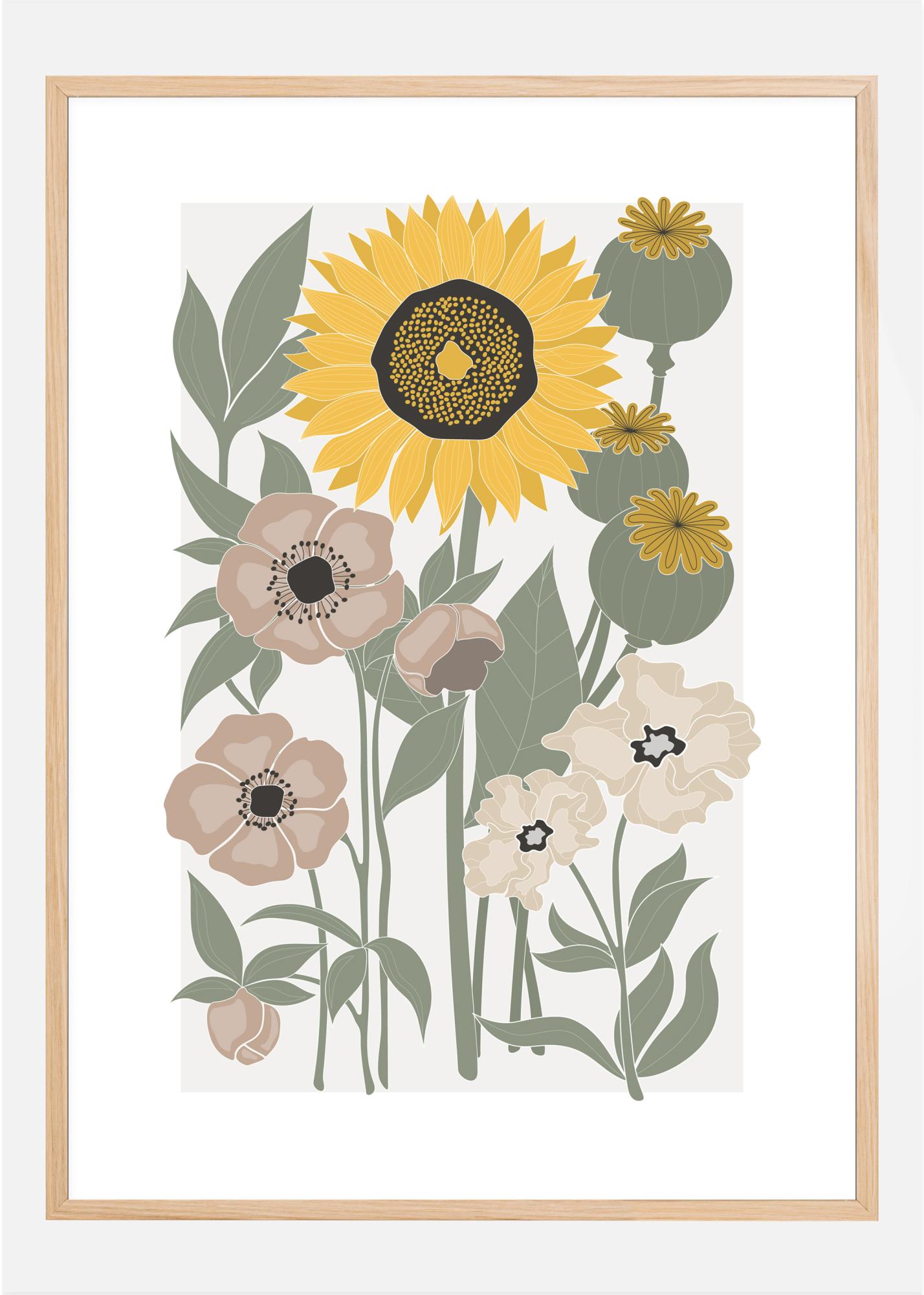 Pehme plakat erinevate lilledega. Hele päevalill domineerib pildi keskosas koos teiste lilledega nagu moonid selles aiaplakatil. Lihtne stiil võimaldab hõlpsasti detaile näha ja nautida seda päikeselist pilti.