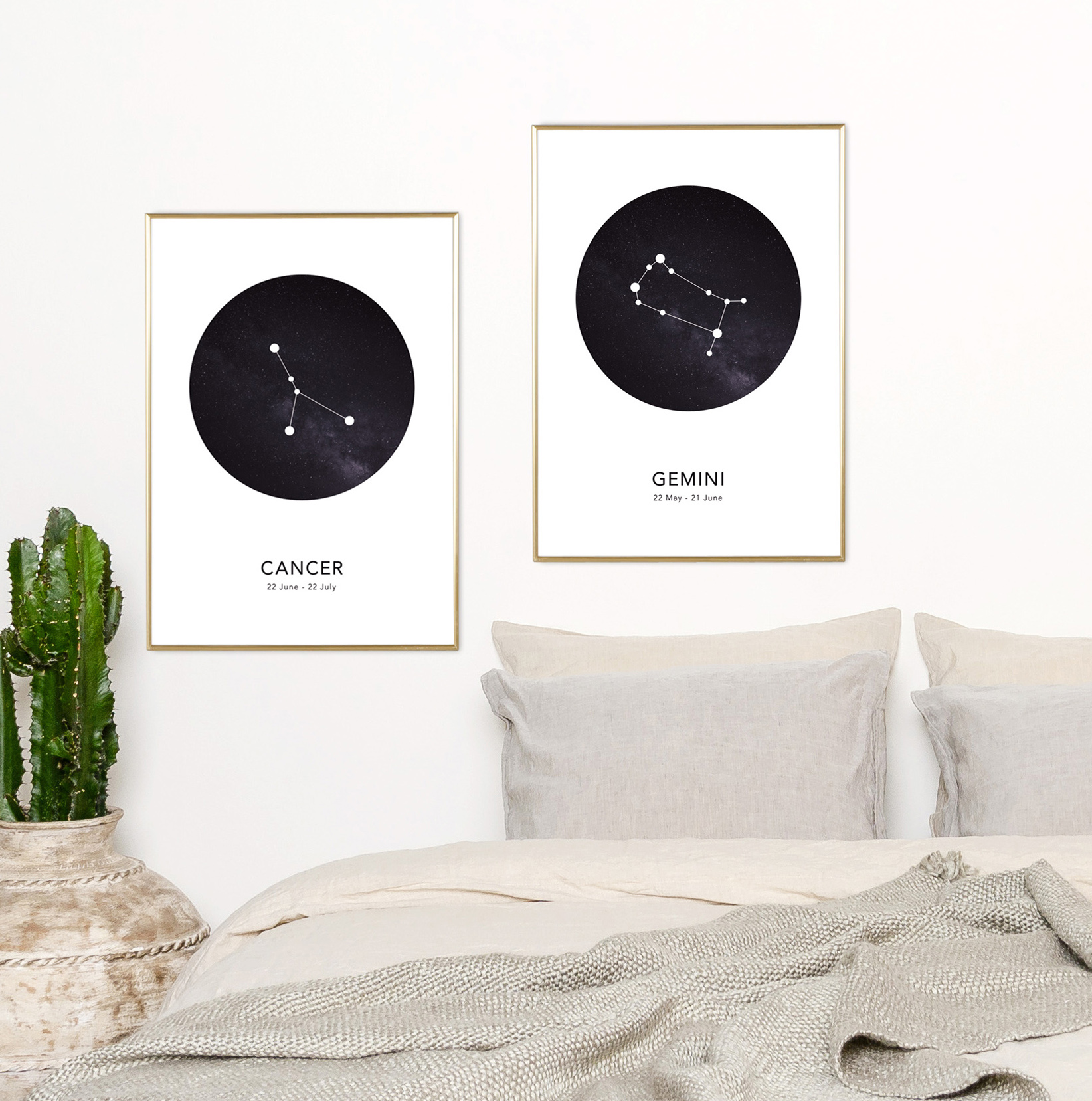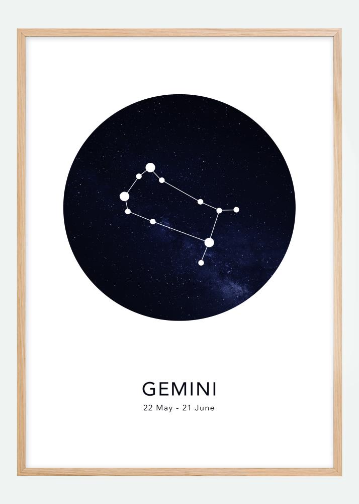 Kingitus isiklik pilt kellelegi, keda sa armastad! Sellel stiilselt plakatil on kujutatud Kaksikute tähtkuju musta ja sinist tähistaeva taustal. Allpool on nimi koos kehtivate kuupäevadega inglise keeles.