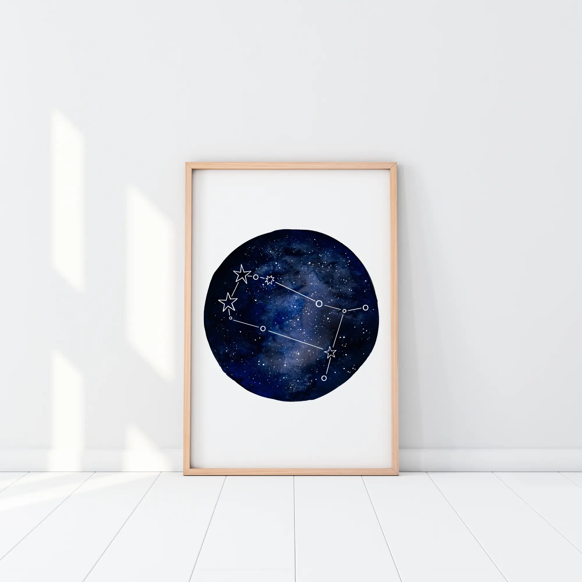 Horoskoobi plakat Kaksikute tähtkujuga. Suur tumesinine ring sisaldab rida säravaid tähti. Kaksikute tähtkuju on selgelt visandatud, et näeksite oma tähtkuju. Riputage see, kui olete Kaksikud ja uhke selle üle.