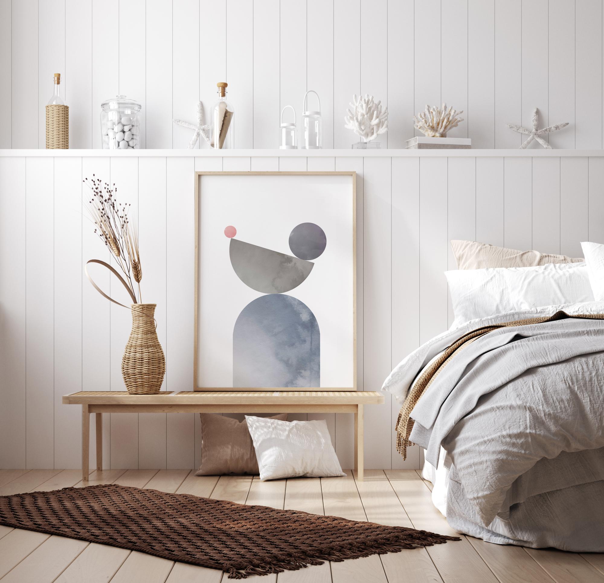 Abstraktne plakat geomeetriliste kujundite ja ringidega. Suur sinine pilvekujuline vorm on allosas. Ülal on hall poolring, mille ühes otsas on väike roosa ring ja teises suur sinine. Sa võid tundideks istuda ja imetleda selle pildi tasakaalu.