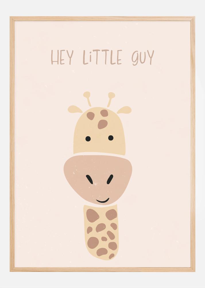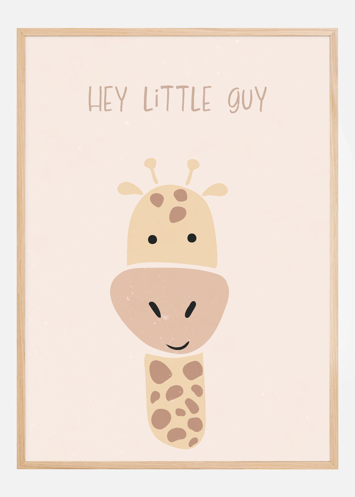 See võluv plakat tekstiga "HEY LITTLE GUY" ja joonistusega kaelkirjaku vasikast on ideaalne seinakaunistus lastetoas või mänguline aktsent teises heledas ruumis. Motiiv iseloomustab õrnu värve, nagu pehme roosa taustal ja soojad beežid ja pruunid toonid kaelkirjaku joonistusel. Joonistatud kaelkirjak, oma lihtsa ja lastele sobiva disainiga, kannab suurt naeratust ja sõbralikke silmi, mis loob kohese sideme ja aitab kaasa rõõmsale ja tervitatavale atmosfäärile.