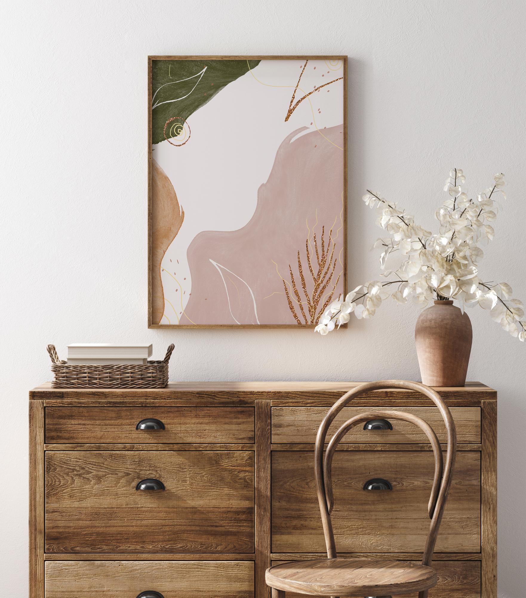 Rahulik abstraktne poster lehtede ja sädelevate detailidega. Suured, lehekujulised värviplokid täidavad selle plakati väikeste sädeleva kullaga loodud okste ja harudega. Sobita see mõne pastellvärviga, et saada stiilne täiendus oma seinale.