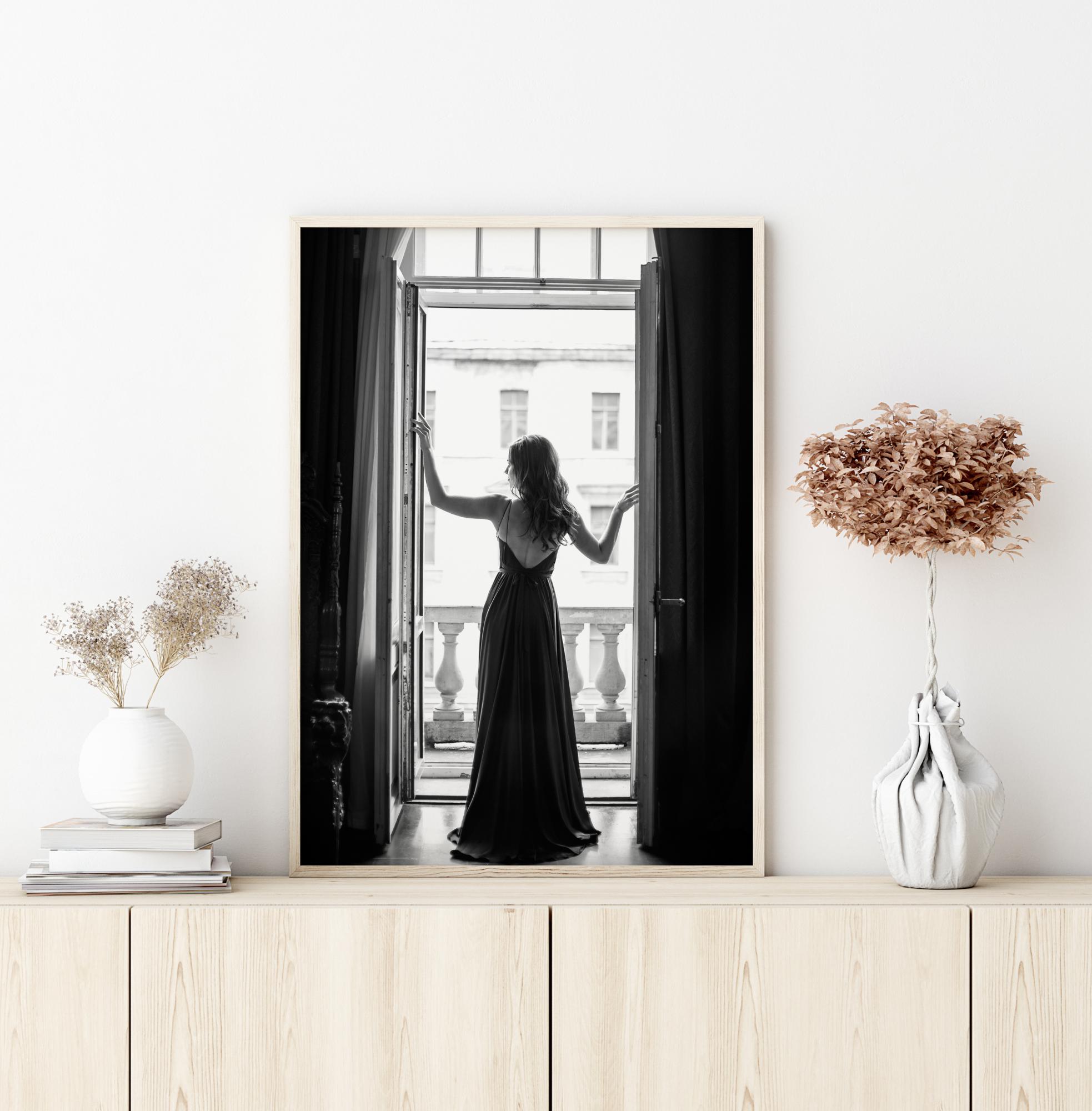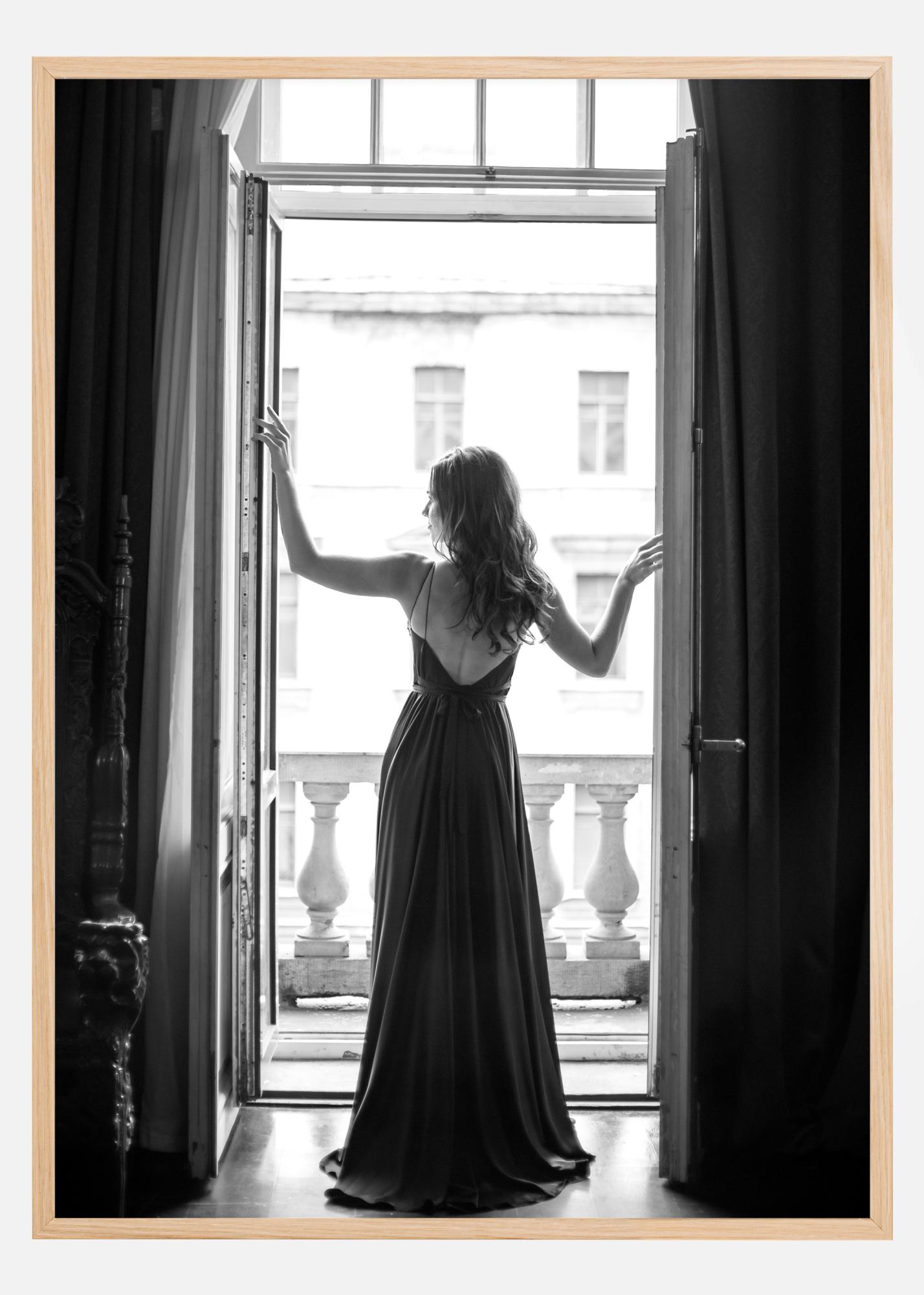 Mustvalge foto naisest pikk kleit seljas, seismas pärani lahtiste rõduuste juures, vaadates päeva poole. Tema ees paistavad kulunud betoonpostid ja kulunud vana fassaad. Plakat, mis hingab imelist segu ilusast ja elavast, vastandudes vanale ja ilmakurnatud.