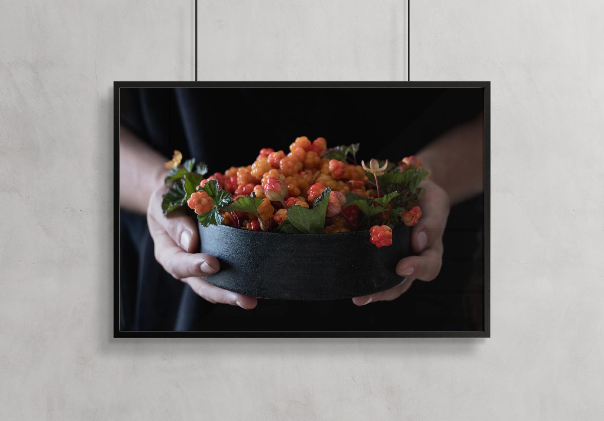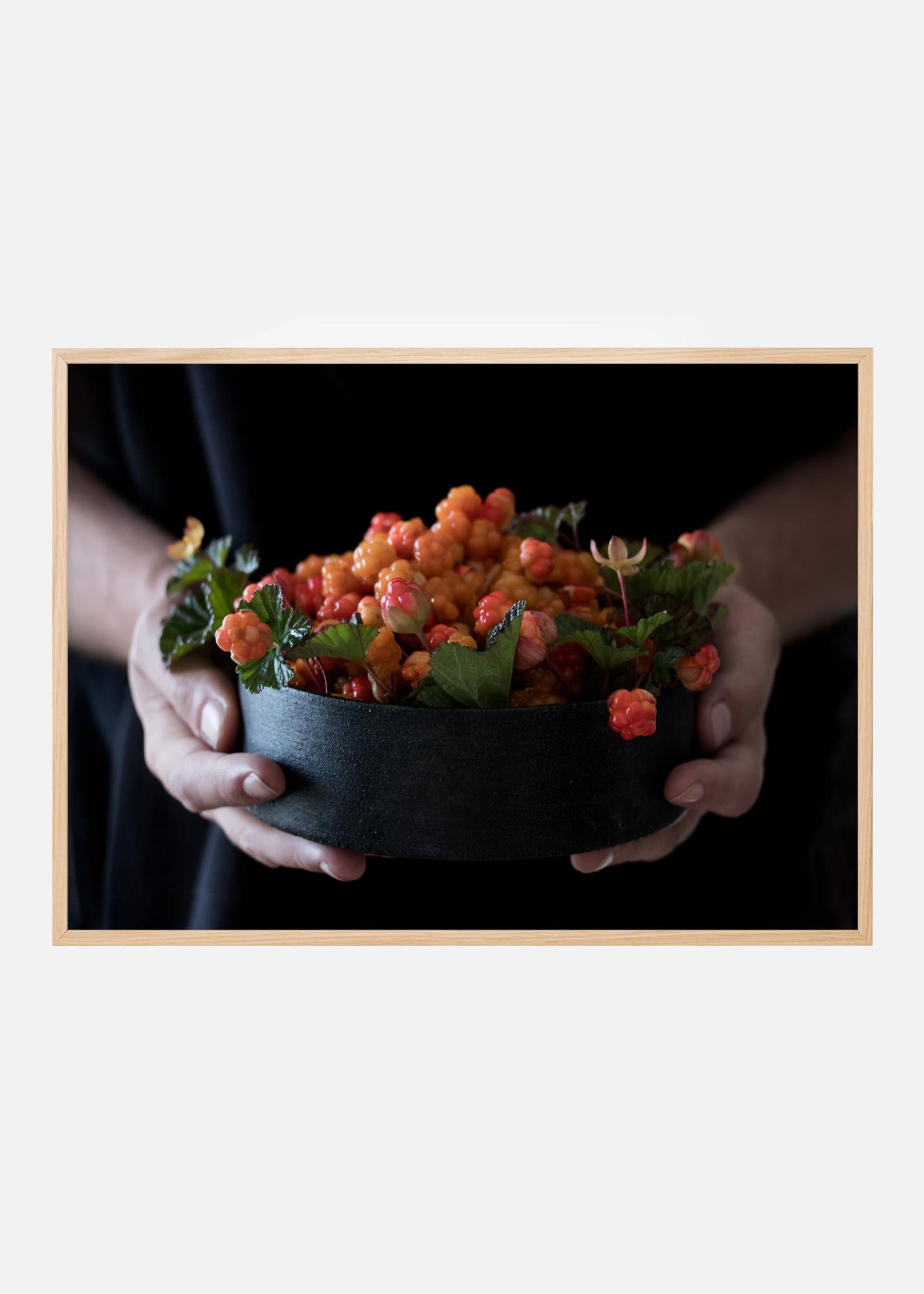 Plakat puuviljadega, millel on kuldsed marjad, mis asuvad kausis, mida hoiavad kaks kätt. See värske foto näitab kuldseid marju ja lehti lihtsas mustas kausis. Kaks kätt haaravad sellest kinni ja hoiavad seda välja, justkui kavatseksid selle sulle just seal ja siis üle anda.