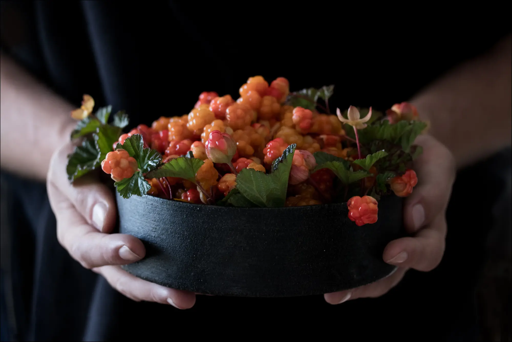 Puuplakat kuldsete marjadega, mis asetsevad kausis, mida hoiavad kaks kätt. See värske foto näitab kuldseid marju ja lehti lihtsas mustas kausis. Kaks kätt hoiavad sellest ja pakuvad justkui, et nad kavatseksid selle kohe teile anda.
