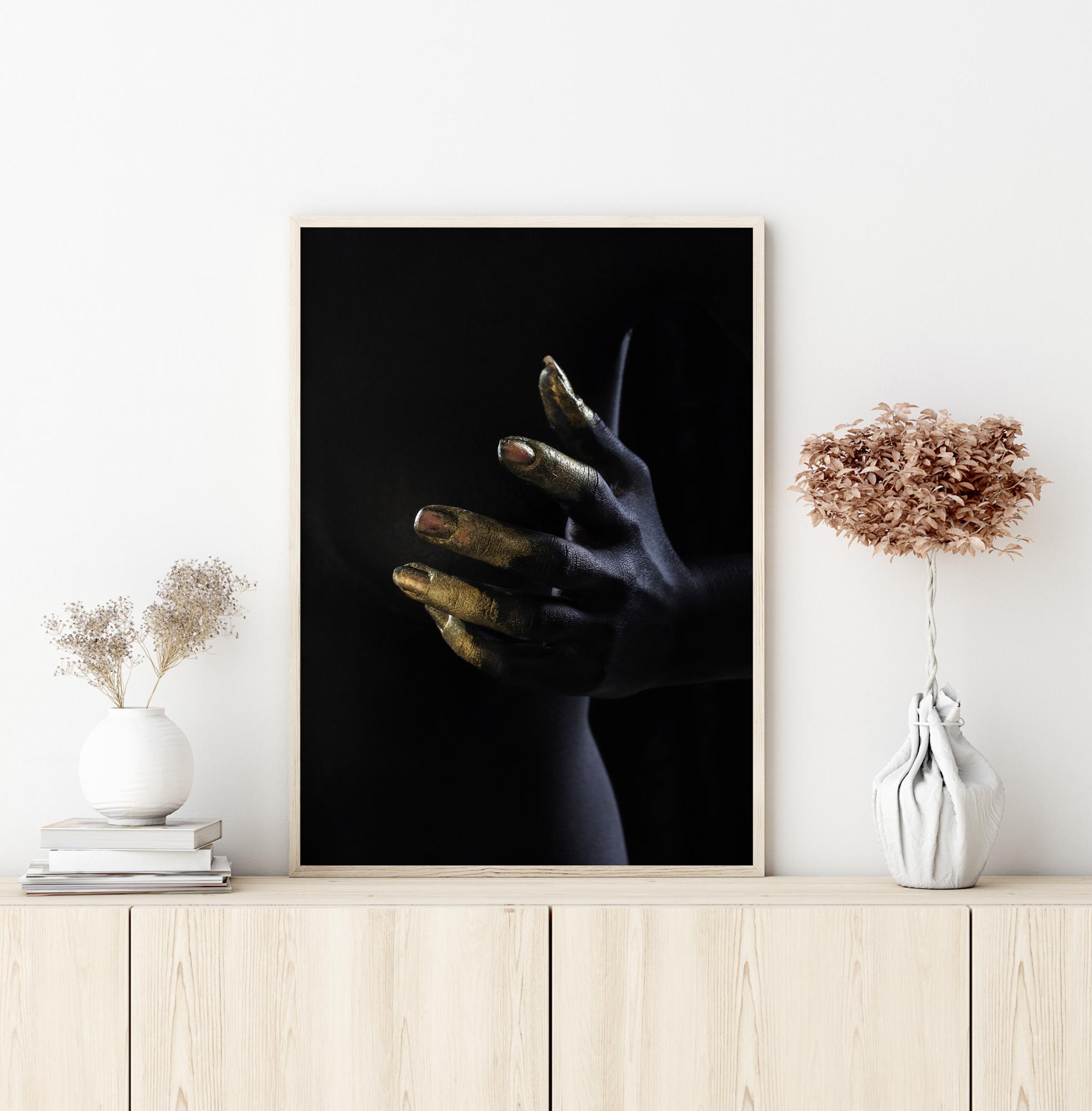 Kontrastne poster, mis on täis draamat, kus käsi on välja sirutatud. Pool kätt on must, samas kui sõrmed on värvitud kullaga, kui käsi on välja sirutatud. Osa kehast on nähtav, valgustatud paremalt poolt, et eristuda mustast taustast. Tõeliselt kunstipärane pilt, mis sobib ideaalselt neutraalsele seinale.