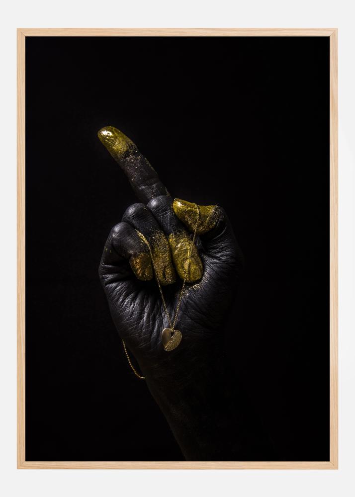 Dramaatiline plakat, millel on must käsi kuldsete sõrmedega, mis osutab vasakule. Suletud rusikas kasutab osutamiseks nimetissõrme, et näidata midagi, mida me ei näe. Käe ümber ripub kuldne medaljon, mis langeb elegantselt kuldsete sõrmede peale. Riputage see valgele või kreemivärvi seinale, et jätta tugev mulje.