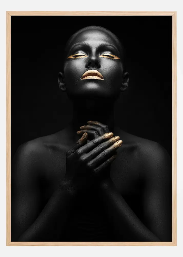 Portreeplakat naisega, kelle nägu on ülespoole suunatud ja silmad suletud musta tausta vastu. Mustaks värvitud nahaga eristuvad mõned detailid, nagu tema kuldsed sõrmeotsad, kuldhõõnsed huuled ja kuldne silmapliiats. Ta sulgeb silmad meditatsioonis, käed rindkerele kokku pandud, sügavalt mõttesse süvenenud. Võta ka sina aega mõtisklemiseks.
