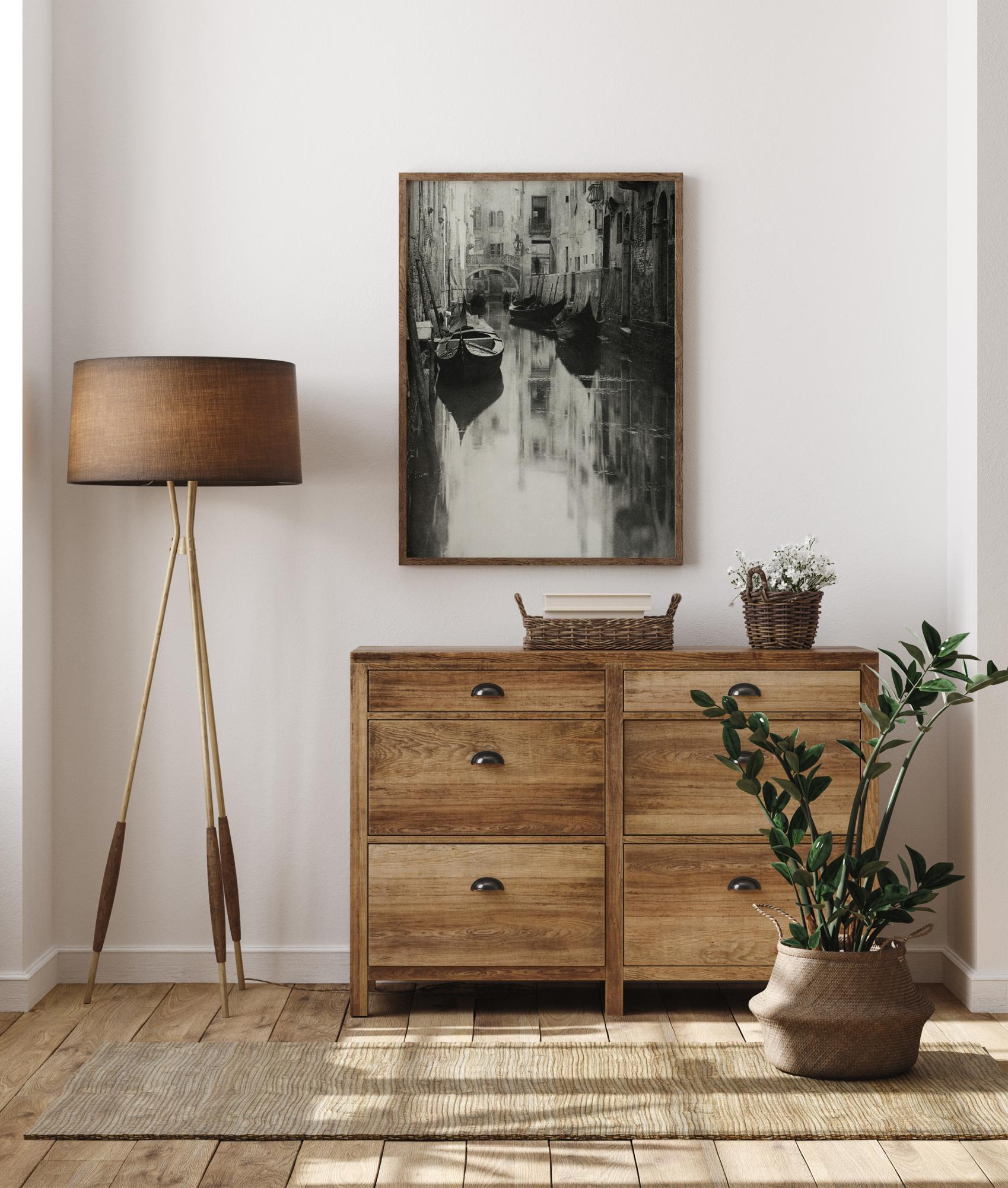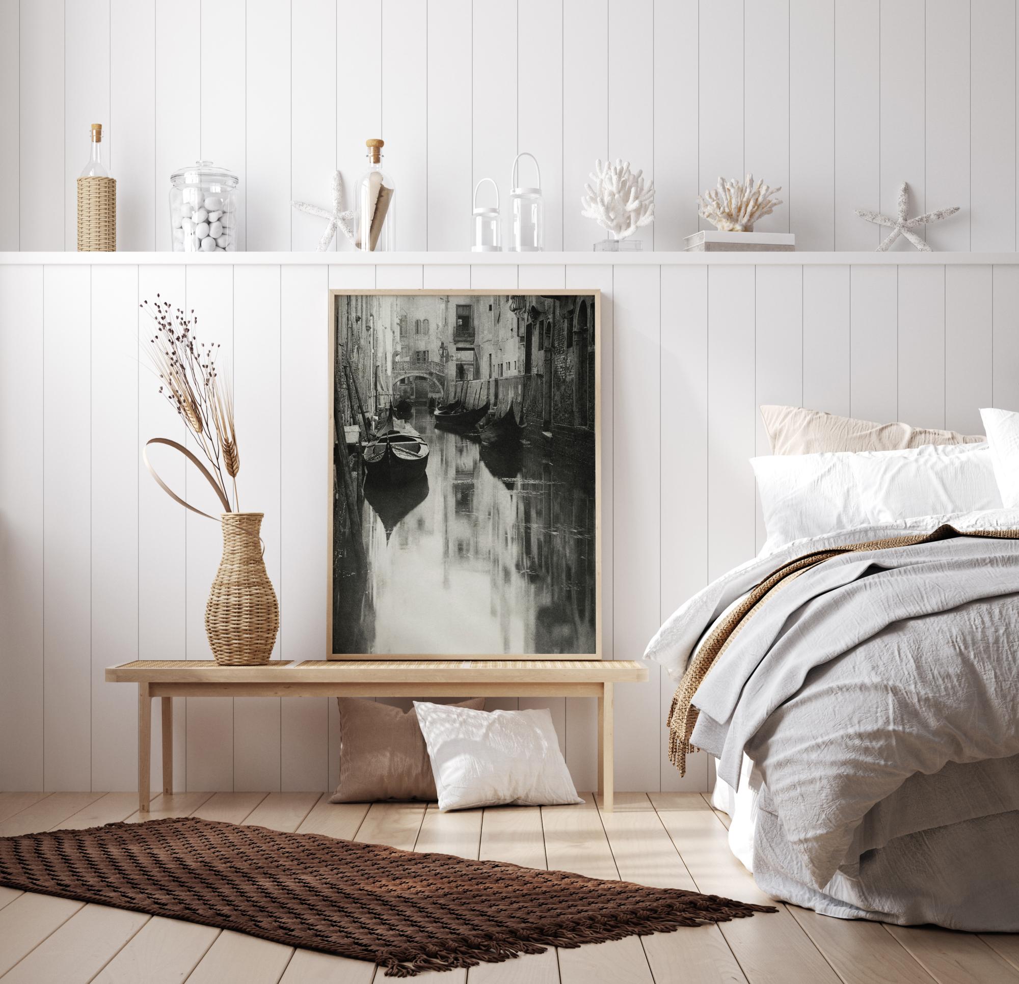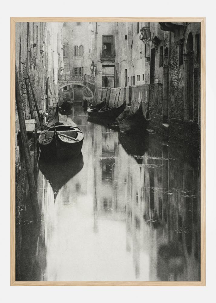Mustvalge plakat gondlitega, mis on sildunud kanalisse Veneetsias. Paadid seisavad liikumatult vaiksel veel majade järskude külgede kõrval. Pilt õhkab rahu ja vaikust selles eraldatud linnaosas.